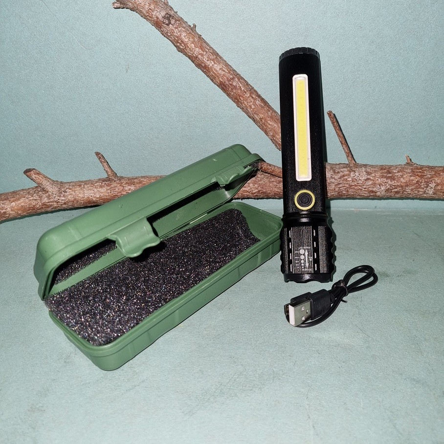 Multifunkčná baterka 2 reflektory - hlavný reflektor s funkciou ZOOM je určený pre bežné svietenie a bočné COB reflektor využijete k osvieteniu priestoru. Nabíjanie sa vykonáva pomocou priloženého USB kábla. Dobíjací konektor je umiestnený v zadnej časti pod gumovým krytom. Dĺžka 14cm.