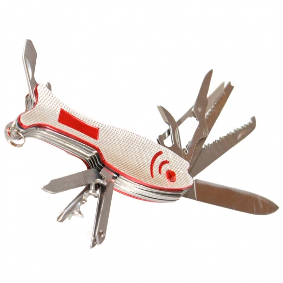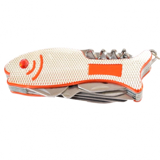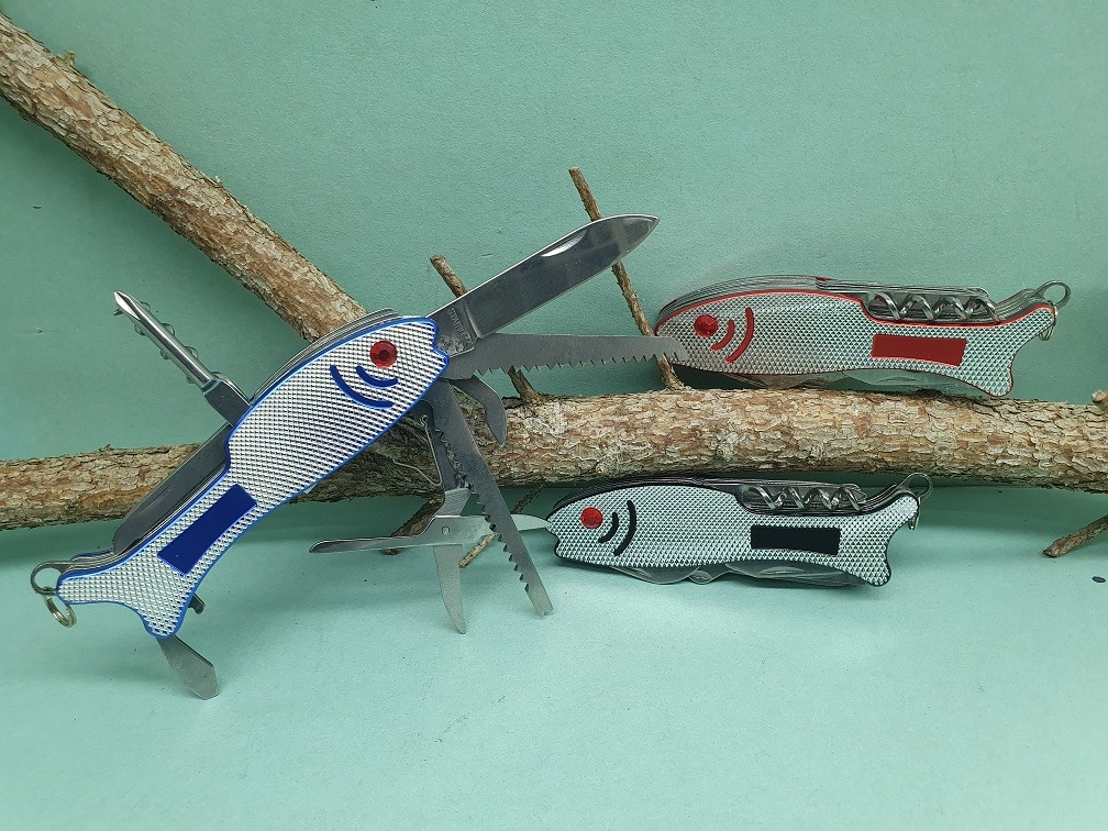 Multifunkčný nôž s motívom ryba v 3 farebných prevedeniach. Obsahuje nôž, otvárač na víno a flaše, pílku, nožničky, pílku na rybacie šupiny, a skrutkovač. Na konci je očko ktoré sa dá zavesiť na kľúče.