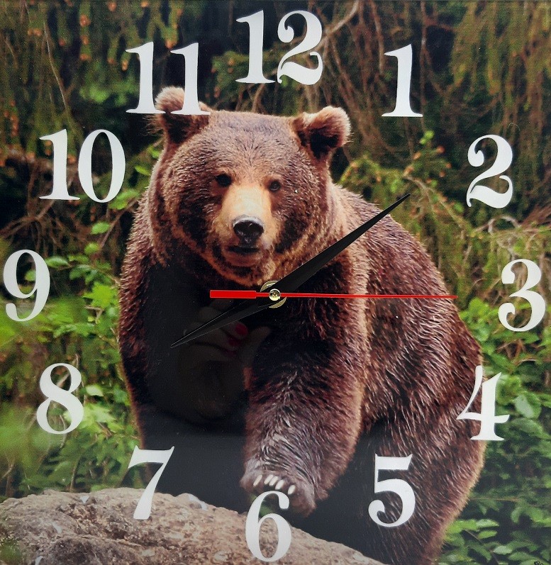 Nástenné hodiny s motívom medveď sú vyrobené z 3 mm plexiskla, fotografia je aplikovaná tlačou, hrany hodín sú upravené laserom, ktorý zaručuje vysoký lesk hrán plexiskla. Strojček v hodinách je na jednu batériu typu AA, ktorá nie je súčasťou balenia.