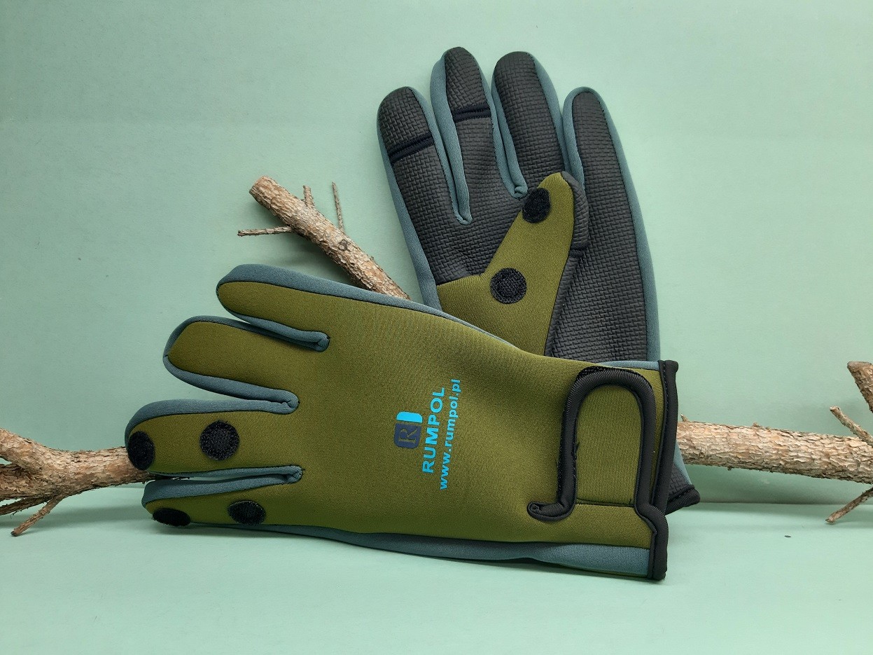 Neoprénové rukavice. Expanzia neoprénových materiálov už dostihla aj rybárske oblečenie, dobre drží teplo, okrem toho sa dobre vetrá a disponuje vodoodpudivou vlastnosťou. Dlaňová časť dostala mäkkú a tenkú gumenú vložku, čím zabezpečuje stabilné držanie svojim nositeľom. Snímateľná vrchná časť na ukazováku , prostredníku a palci . Suchý zips na stiahnutie okolo zápästia.