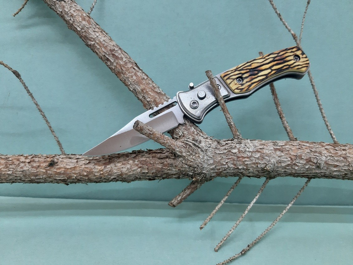 Vreckový vyskakovací nôž Kandar s nerezovou čepeľou o dĺžke 7 cm a rukoväťou s imitáciou paroh. Celková dĺžka noža je 17 cm. Má poistku proti samovoľnému zatvoreniu.