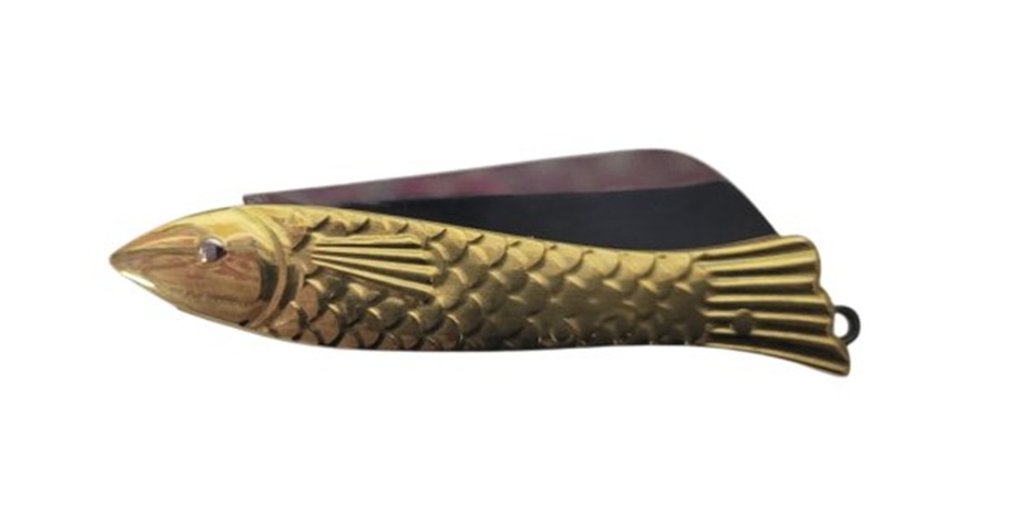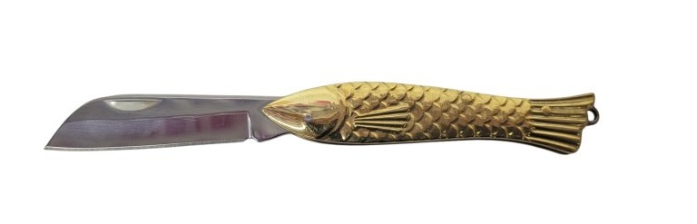 Nôž zatvárací tradičná Rybička zlatá 14/8cm .Vreckový nožík nemôže chýbať žiadnemu dospievajúcemu chlapcovi .Nôž je celokovový z nerezovej ocele ,rukoväť v tvare rybky peknej zlatej farbe. Na chvoste rybky je očko na zavesenie ako prívesok.Tradícia Československa.