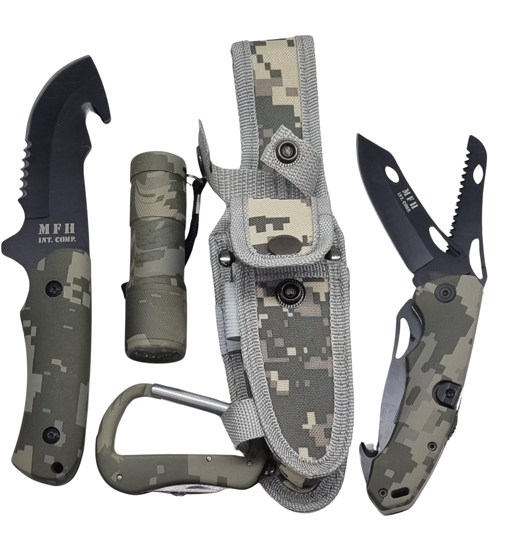 Praktická viacúčelová sada. Pozostáva z noža s pílkou, skladacieho multifunkčného noža, karabíny, baterky a puzdra.