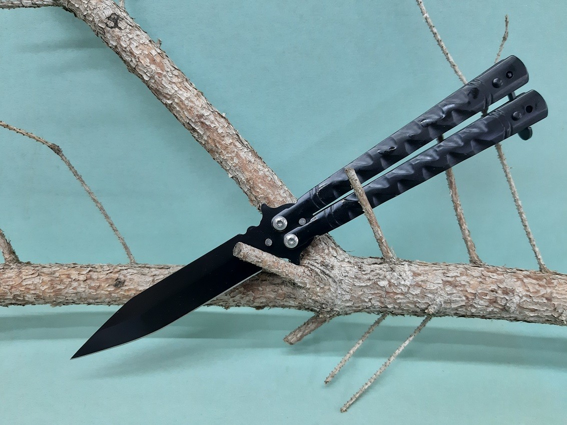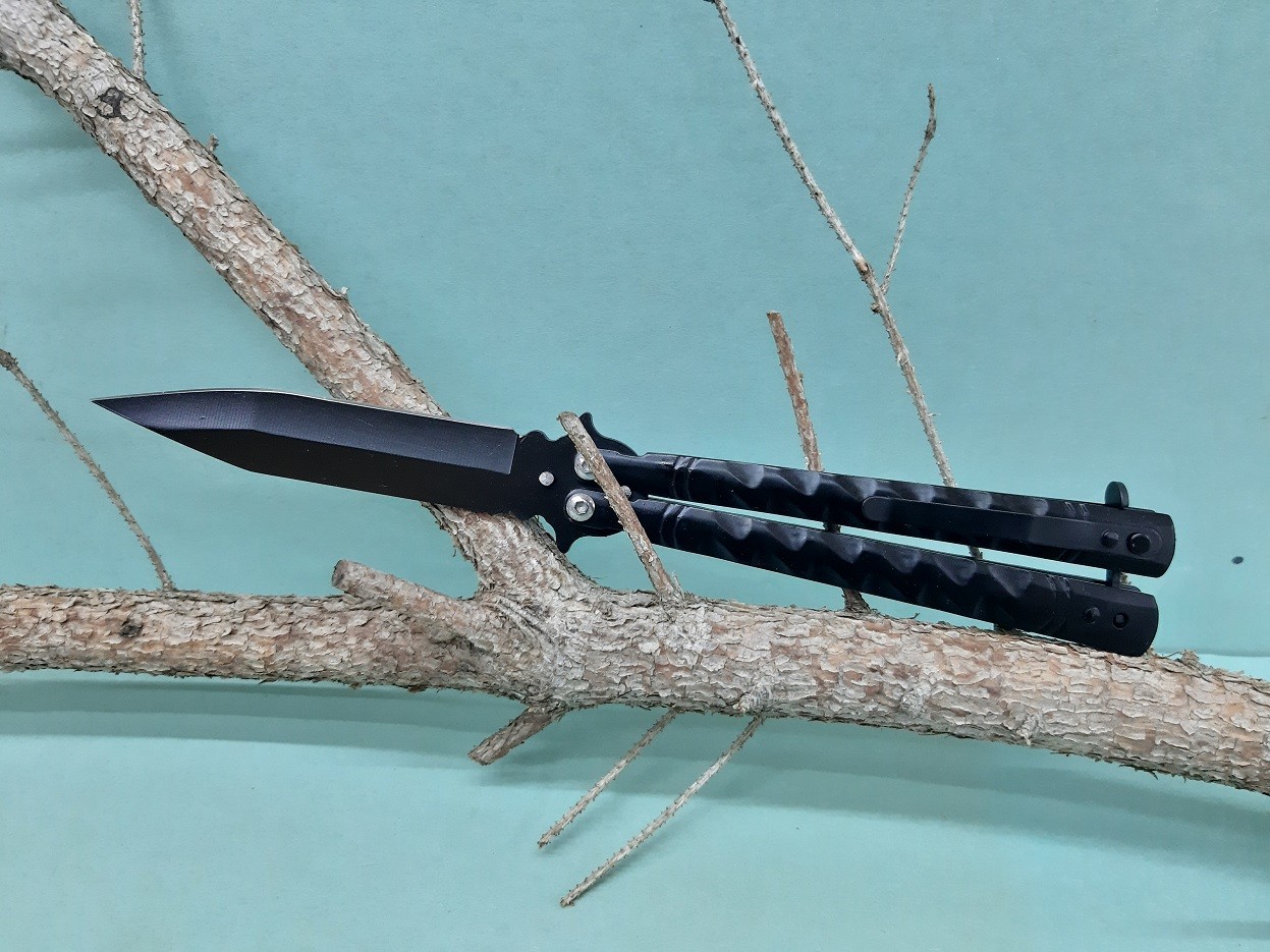 Nôž skladací, motýľ s nerezovou čepeľou, plnofarebný-čierny. Na rukoväti je klip a kolík pre zaistenie v otvorenom aj zatvorenom stave. Dĺžka noža 22/10cm.