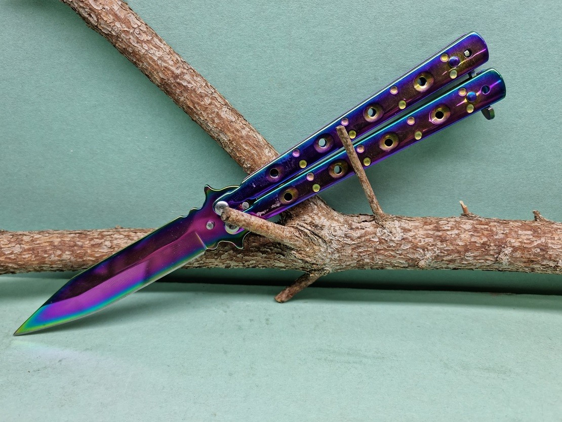 Nôž skladací, motýľ s nerezovou čepeľou, plnofarebný-dúha. Na rukoväti je kolík pre zaistenie v otvorenom aj zatvorenom stave. Dĺžka noža 23/10cm.
