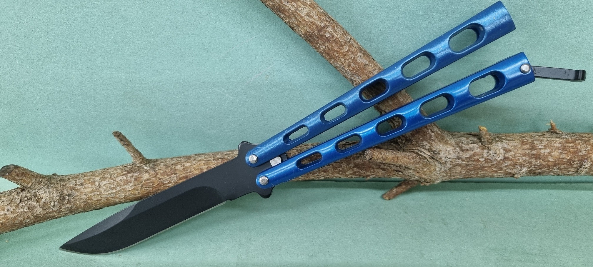 Nôž skladací, motýľ s nerezovou čiernou čepeľou, modrou rukoväťou. Na rukoväti je kolík pre zaistenie v otvorenom aj zatvorenom stave. Kvalitné prevedenie nitované, bez skrutiek. Dĺžka noža 23/10,5cm.