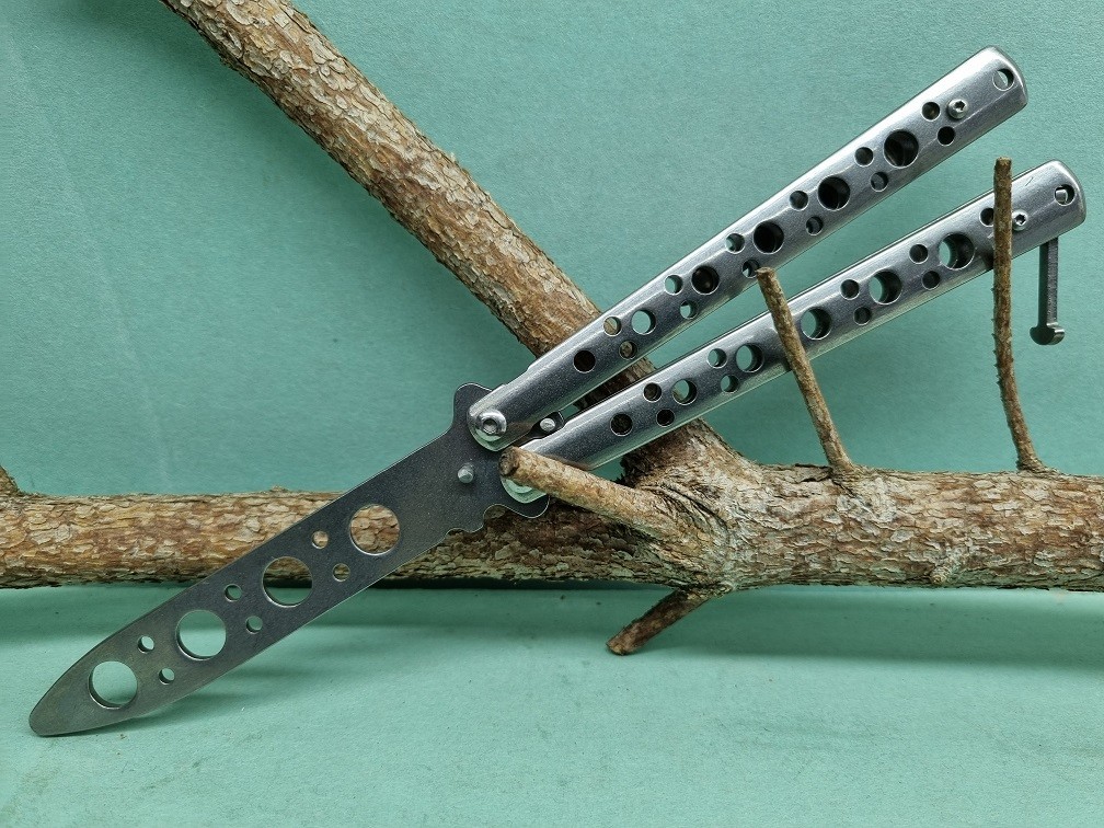 Nôž motýľ, skladací tréningový s tupou čepeľou proti poraneniu strieborný. Na rukoväti je kolík pre zaistenie v otvorenom aj zatvorenom stave. Dĺžka noža 21,5/10cm.