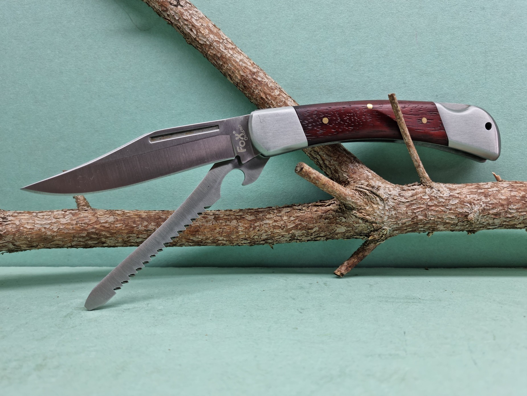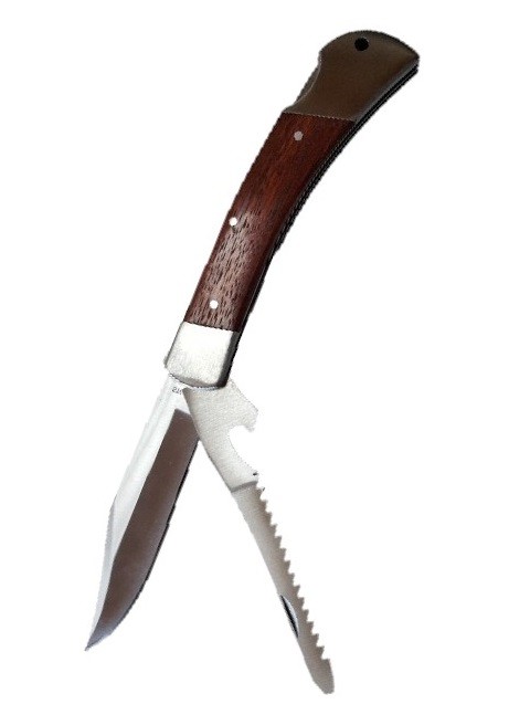 Nôž vreckový viacúčelový, nerezová čepeľ noža 10 cm, nerezová pílka 10 cm dvojradová. Rukoväť kombinovaná drevo - kov. Na konci rukoväte je očko na prevlečenie šnúrky. Celková dĺžka noža 22cm. Vhodný do prírody aj do domácnosti.