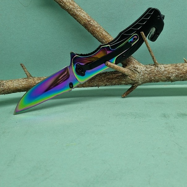 Zatvárací nôž 613 v dúhovo-čiernom prevední má dĺžku čepele 10 cm a celkovú dĺžku 22 cm. Na spodnej časti noža hrot na rozbíjanie skla a taktiež aj rezač na špagát alebo lanko. Na zadnej časti sa nachádza klip na uchytenie na opasok.