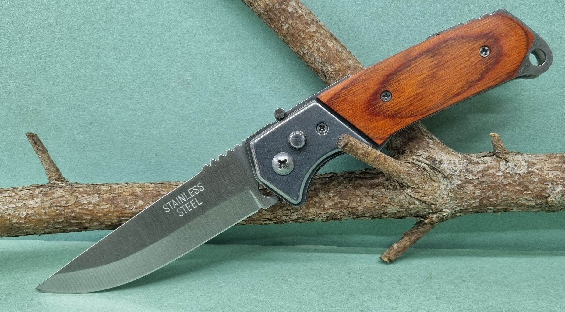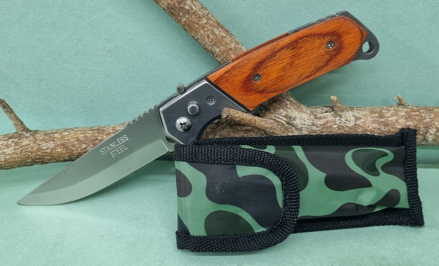 Vreckový vyskakovací nôž s nerezovou čepeľou o dĺžke 9cm . Celková dĺžka noža je 20cm. Rukoväť drevená. Má poistku proti samovoľnému zatvoreniu. Súčasťou je nylonové púzdro farby kamufláž.