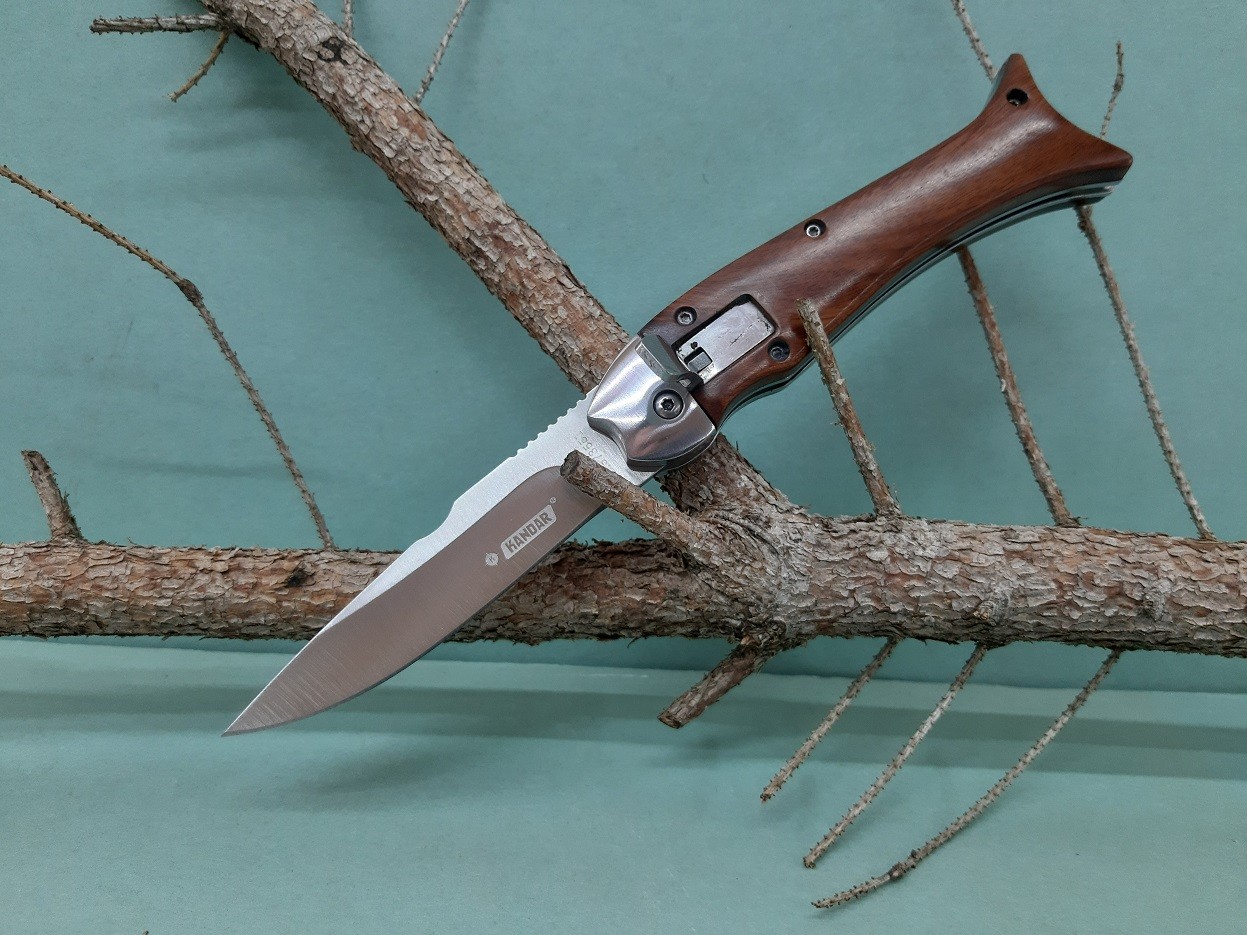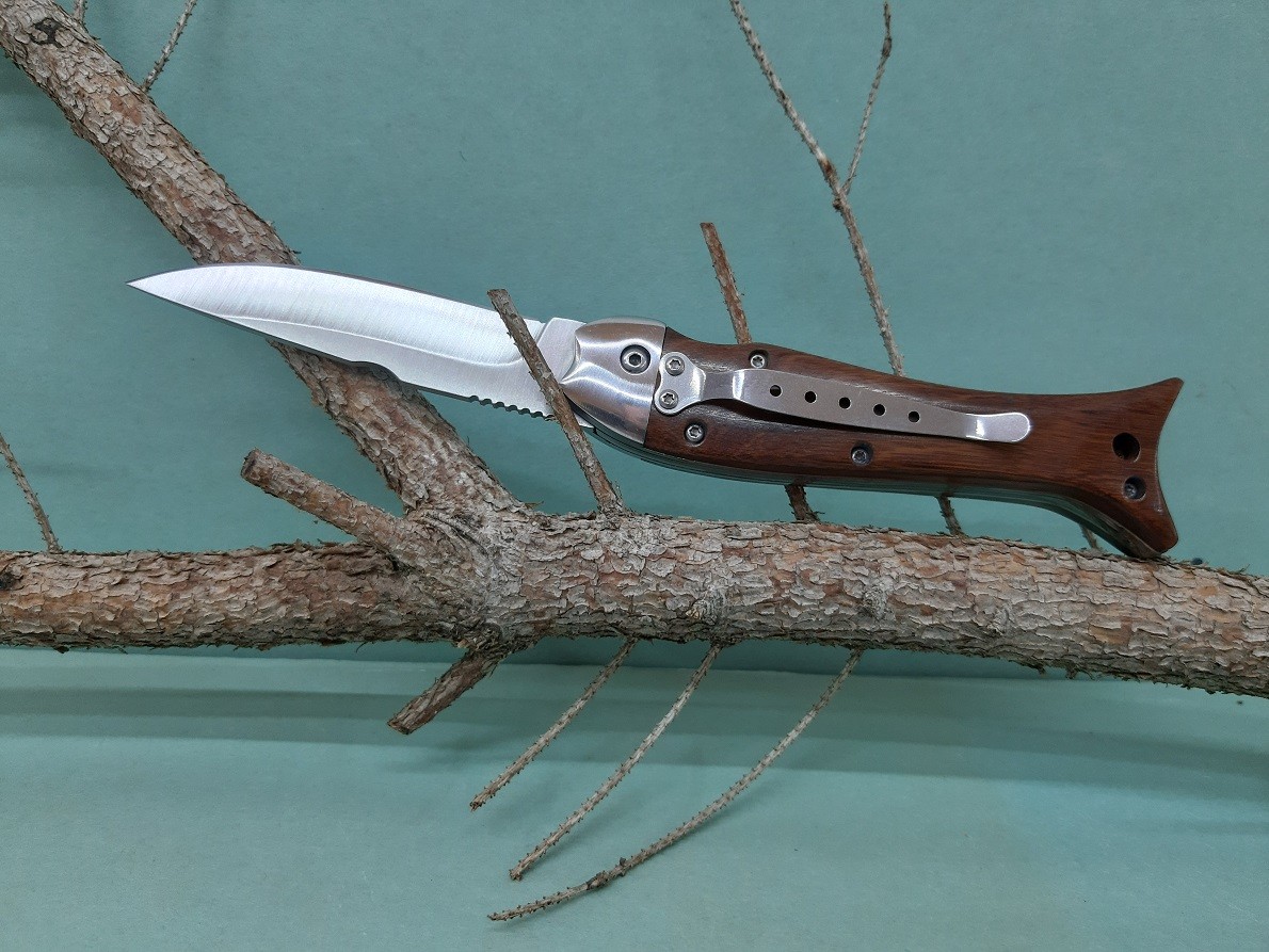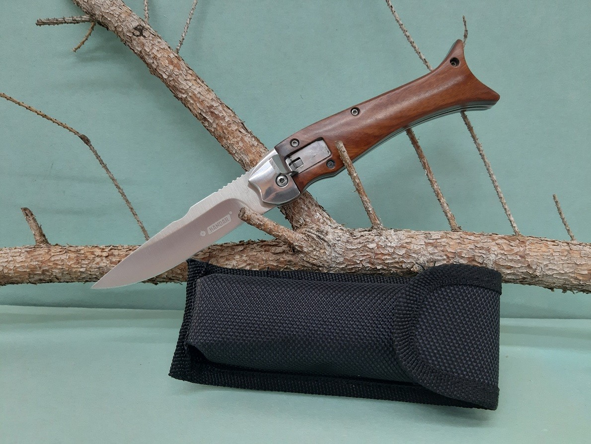 Vreckový zatvárací nôž, nerezová vyskakovačka s čiernym nylónovým púzdrom a drevenou rukoväťou. Dĺžka čepele je 9 cm a celková dĺžka noža je 21 cm. Na zadnej strane sa nachádza klip na uchytenie na opasok.