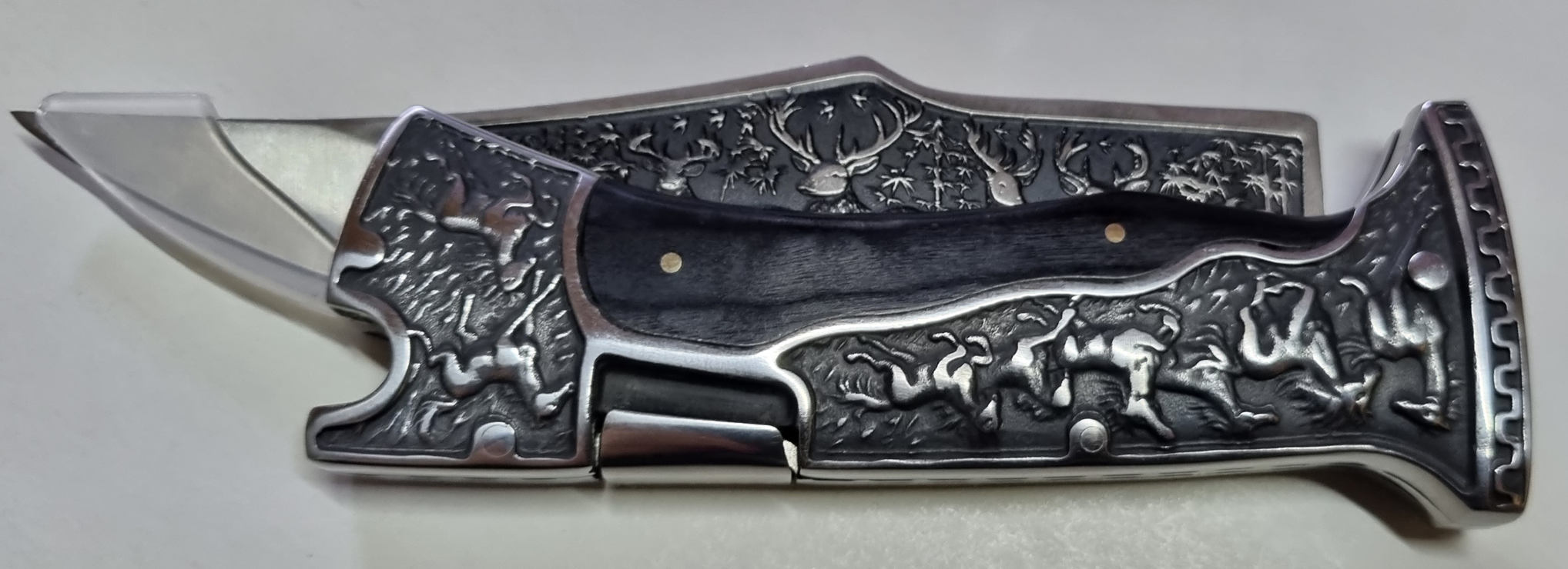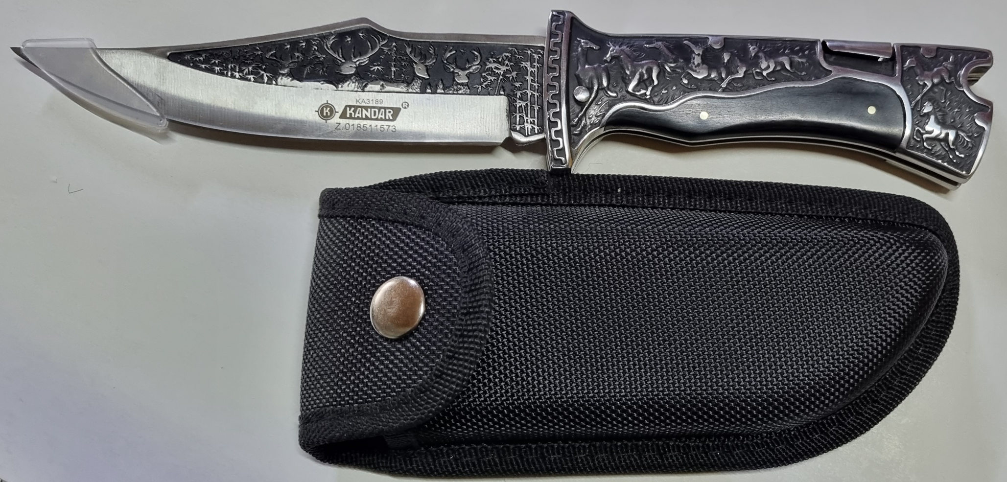Zatvárací nôž Kandar s 15 cm nerezovou gravírovanou čepeľou. Rukoväť je kombinácia dreva a gravírovaného kovu. Celková dĺžka noža je 28 cm. Dodáva sa spolu s čiernym púzdrom.