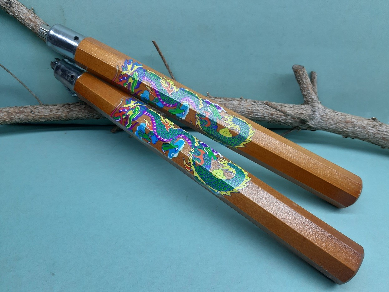 Nunčáky drevené v tvare šesťhrana s motívom čínskeho draka s retiazkou s kĺbom. Nunčáky sú nástrojom na cvičenie bojových umení.
