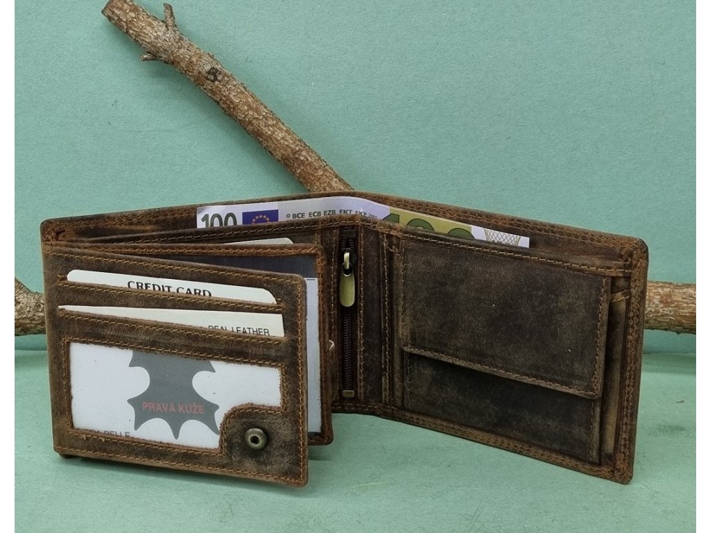 Pánska kožená embosovaná peňaženka z kvalitnej kože s motívom -diviak na prednej strane bez zapínania. Má 9 priehradiek na karty, 3 priehľadné priehradky na fotky alebo doklady, 1 veľký mincovník, 1 zipsový priečinok a 2 priehradky na bankovky. Rozmery: dĺžka 12,5 cm, výška 10 cm, šírka 3,5 cm.