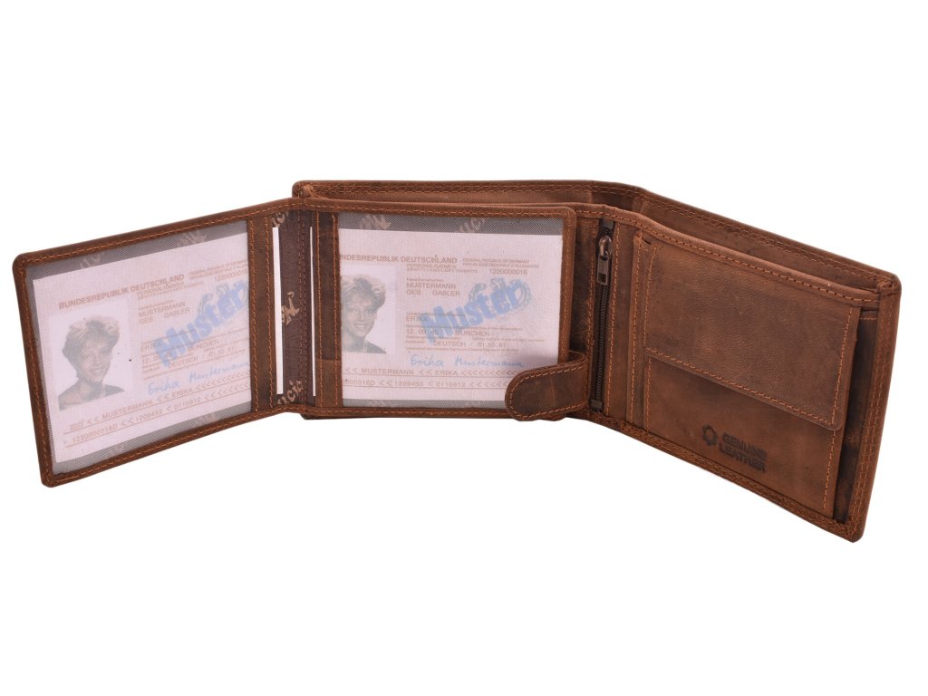 Pánska kožená embosovaná peňaženka z kvalitnej kože s motívom - futbalová lopta na prednej strane s bočným zapínaním na cvok. Má 9 priehradiek na karty, 3 priehľadné priehradky na fotky alebo doklady, 1 veľký mincovník, 1 zipsový priečinok a 2 priehradky na bankovky. Rozmery: dĺžka 12,5 cm, výška 10 cm, šírka 3,5 cm.