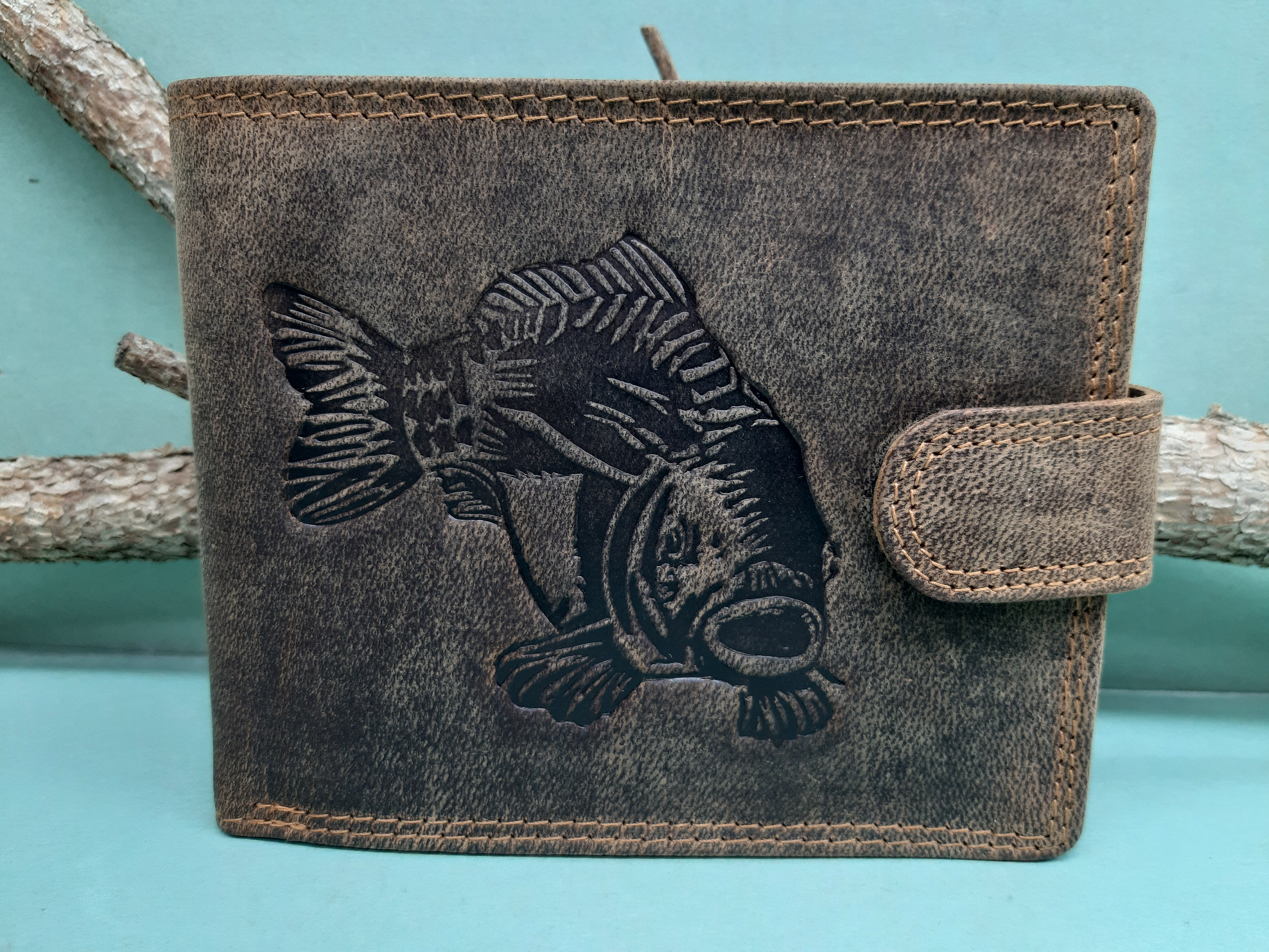Pánska kožená embosovaná peňaženka z kvalitnej kože s motívom -kapor na prednej strane s bočným zapínaním na cvok. Má 9 priehradiek na karty, 3 priehľadné priehradky na fotky alebo doklady, 1 veľký mincovník, 1 zipsový priečinok a 2 priehradky na bankovky. Rozmery: dĺžka 12,5 cm, výška 10 cm, šírka 3,5 cm.