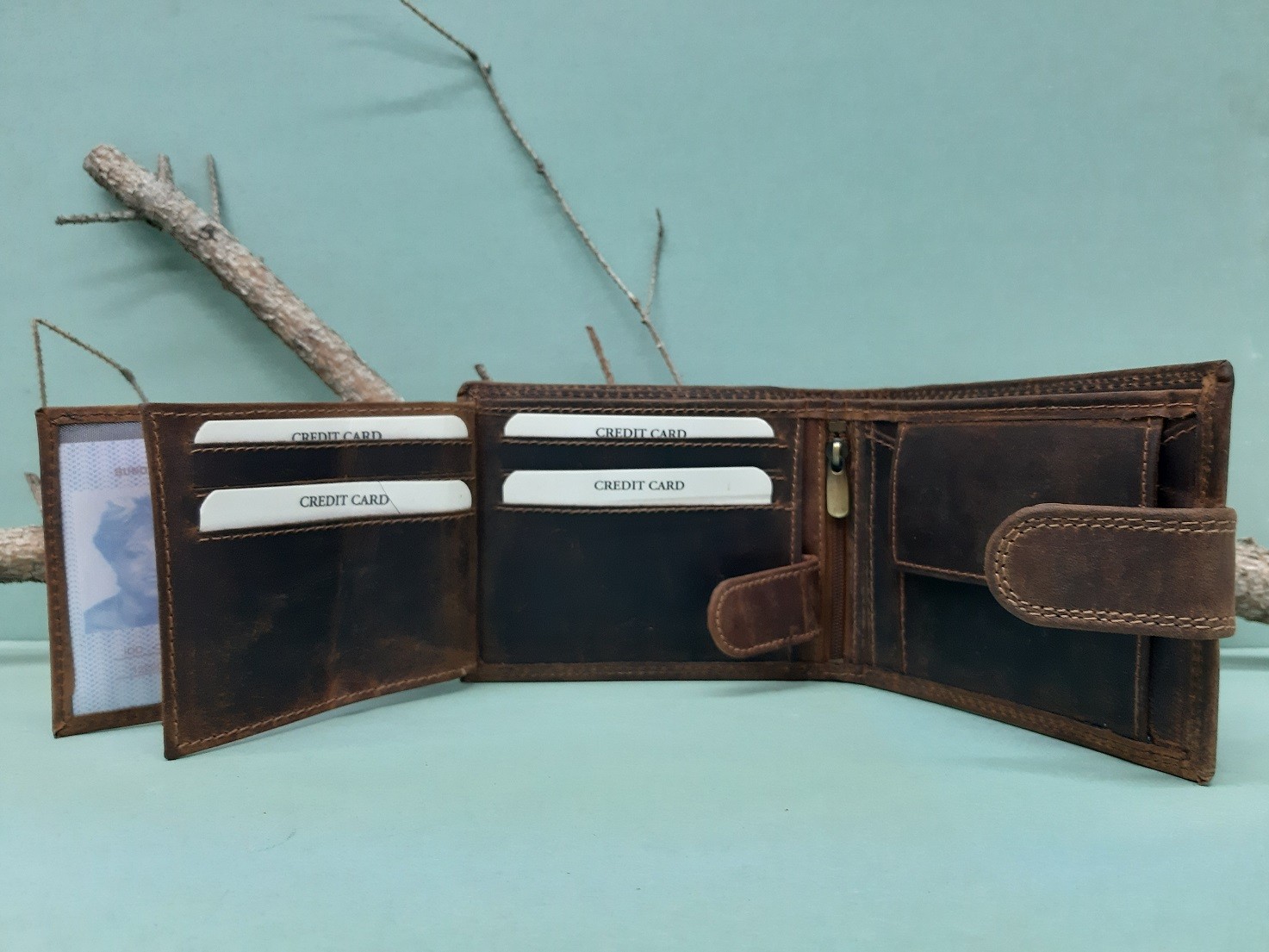Pánska kožená embosovaná peňaženka z kvalitnej kože s motívom -pstruh na prednej strane s bočným zapínaním na cvok. Má 9 priehradiek na karty, 3 priehľadné priehradky na fotky alebo doklady, 1 veľký mincovník, 1 zipsový priečinok a 2 priehradky na bankovky. Rozmery: dĺžka 12,5 cm, výška 10 cm, šírka 3,5 cm.
