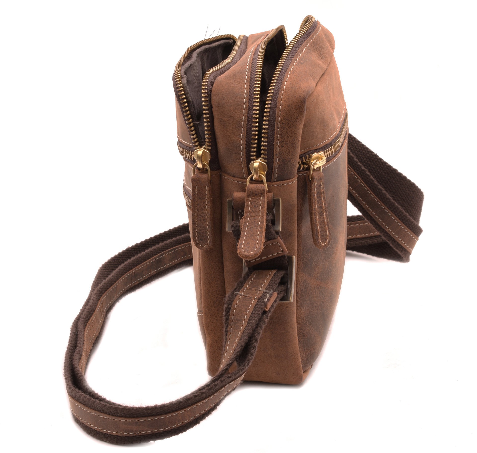 Pánska kožená taška crossbody má 2 komory na zips, 2 zipsové priehradky na prednej strane, 1 zipsovú priehradku na zadnej strane a popruh na rameno: šírka 3 cm, dĺžka popruhu 150cm. Rozmery tašky sú 20x19x7cm.