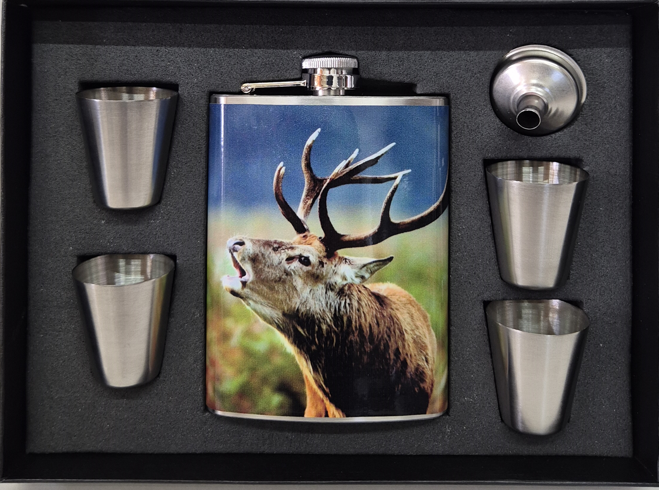Úvod » Darčekové predmety » Ploskačky » Ploskačky s pohárikmi » Ploskačka Jeleň lesný SADA 4 poháriky a lievik 240ml
