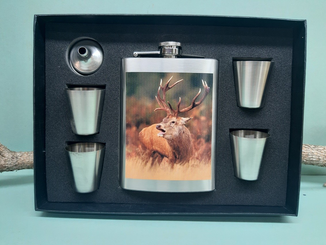 Darčeková sada obsahuje nerezovú ploskačku, 4 poháriky a lievik pre jednoduchšie nalievanie destilátu. Objem ploskačky s motívom jeleňa je 240ml. Komplet je balený v krásnom darčekovom balení. Sada je vhodná ako dekorácia alebo praktický darček pre milovníkov prírody a lesnej zvery.