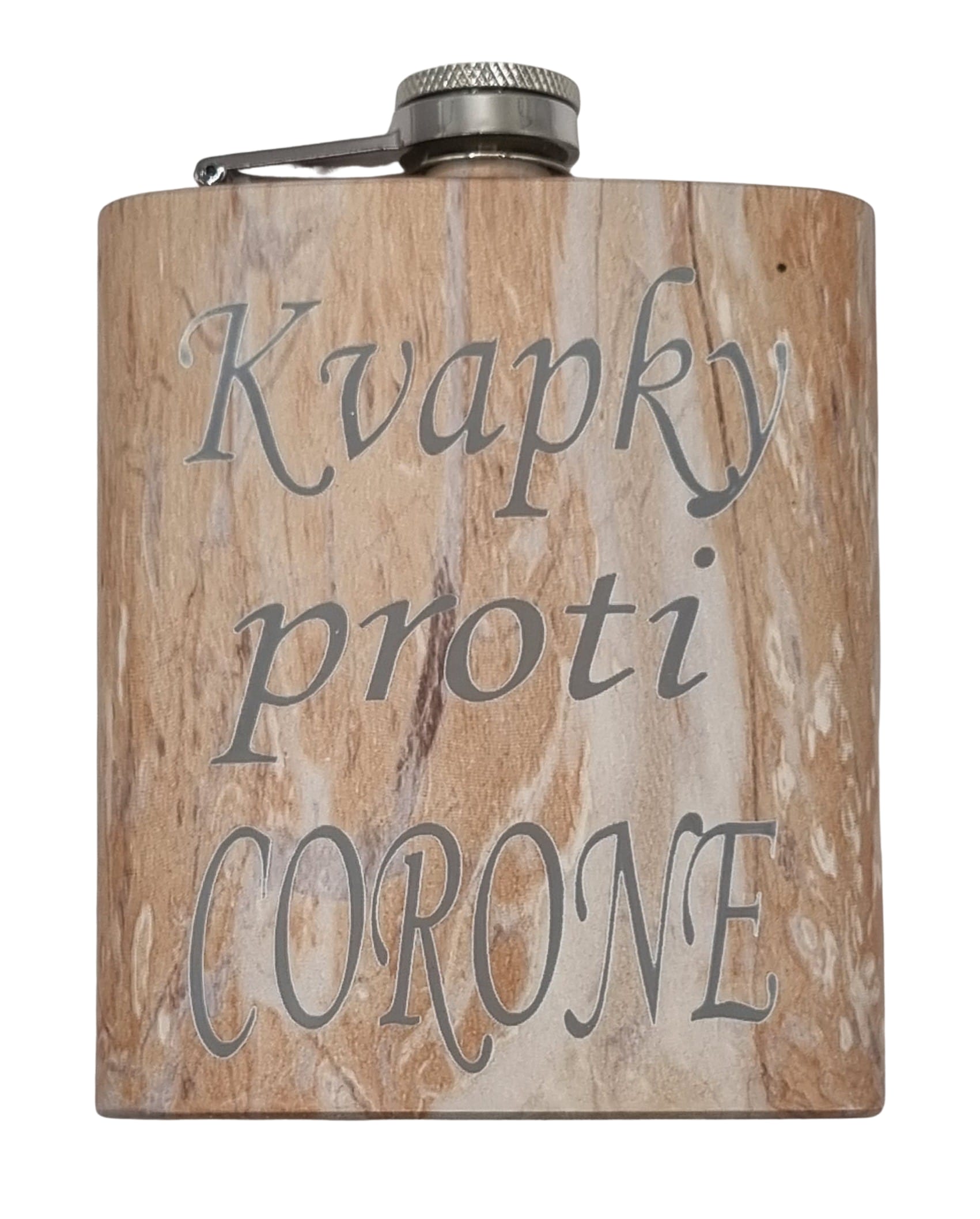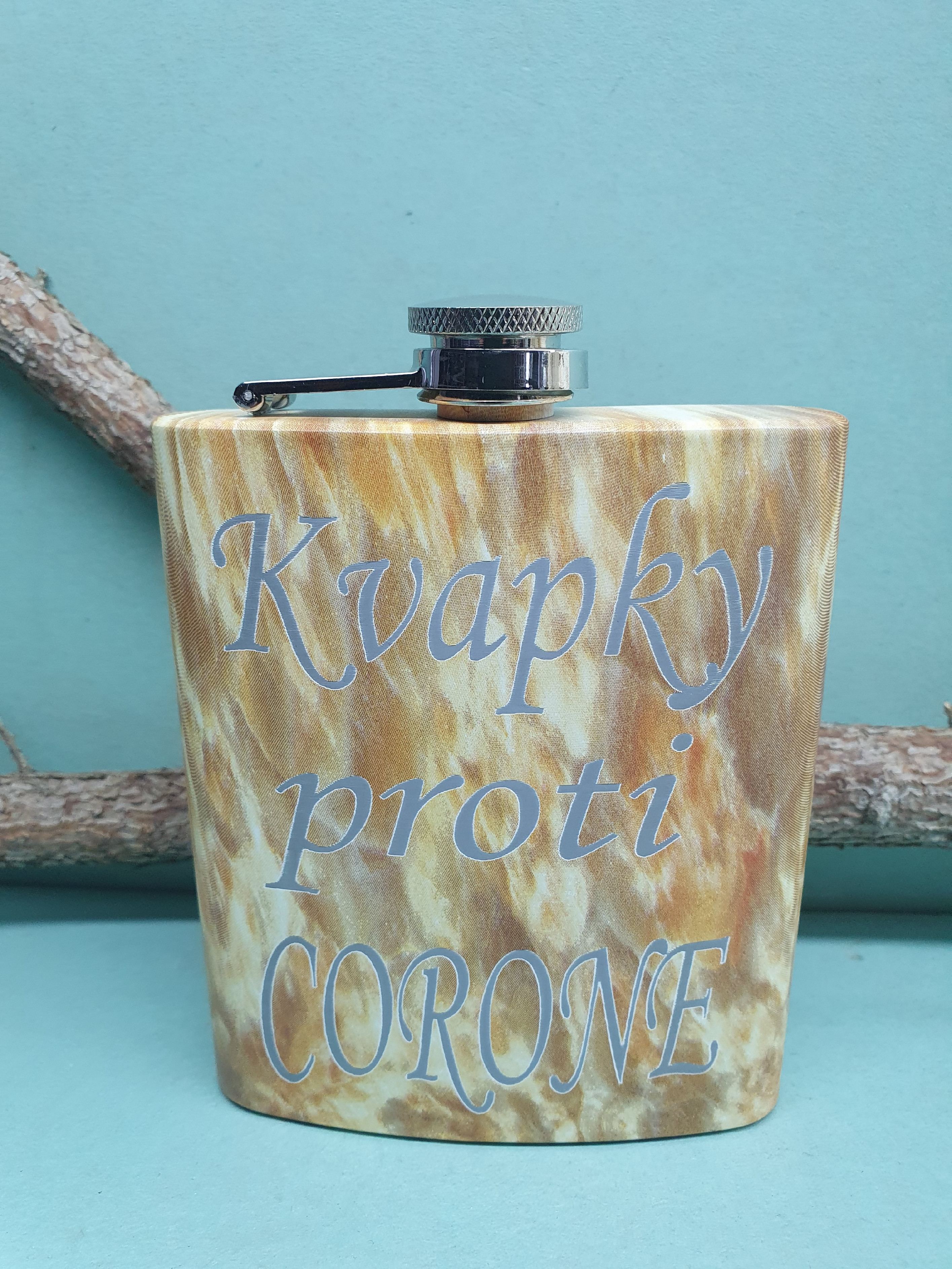 Mramorová nerezová ploskačka s vtipným gravírovaným textom Kvapky proti Corone. Pevný uzáver umožňuje krátkodobý prenos alkoholických nápojov v objeme 200 ml. Ideálny darček k narodeninám pre rybárov a poľovníkov, ktorí trávia dlhé večery čakaním na svoj úlovok.
