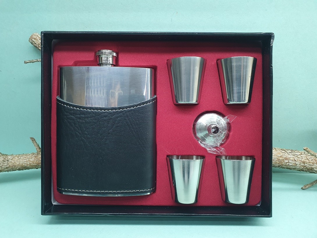 Nádherná darčeková sada nerezová ploskačka + 4 poháriky a lievik pre jednoduchšie nalievanie destilátu. Objem ploskačky potiahnutej kožou je 180ml. Komplet je balený v krásnom darčekovom balení. Sada je vhodná ako dekorácia alebo praktický darček hlavne pre mužov, poľovníkov, rybárov, či turistov.