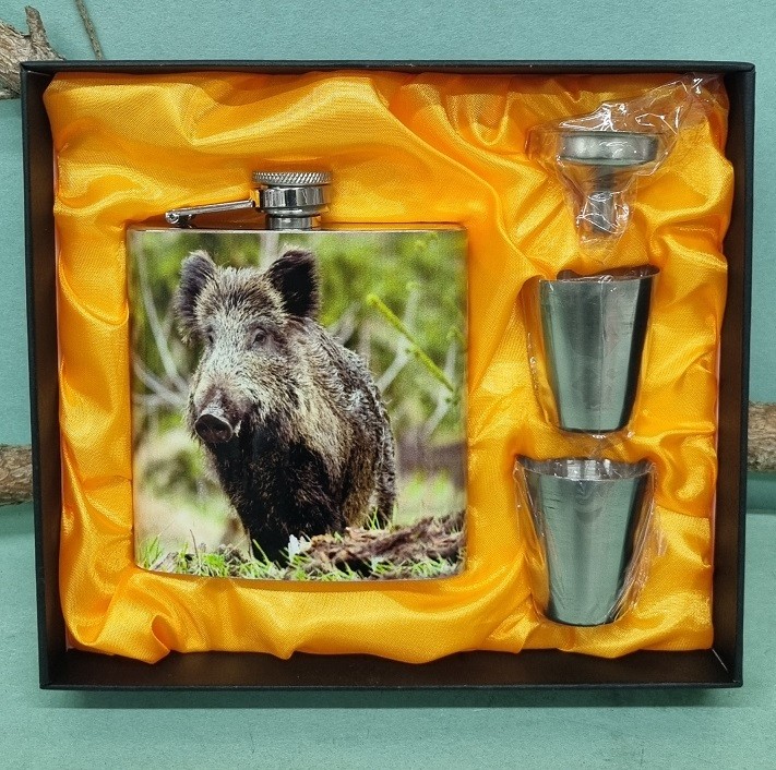 Nádherná darčeková sada ploskačka Diviak + 2x pohárik a lievik pre jednoduchšie nalievanie destilátu. Objem ploskačky 180ml. Komplet je balený v krásnom darčekovom balení. Nerezová ploskačka je potlačená motívom Diviaka. Sada je vhodná ako dekorácia alebo praktický darček hlavne pre mužov, poľovníkov, rybárov, či turistov.
