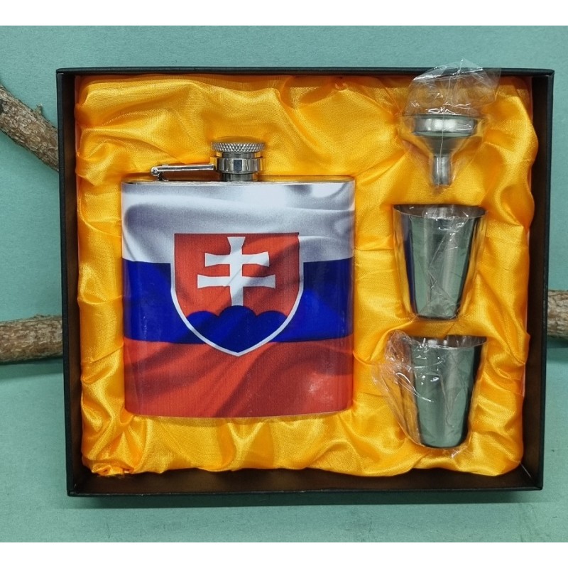 Darčeková sada obsahuje ploskačku s objemom 1,8dcl s motívom Slovenská vlajka, 2 ks pohárikov a lievik. Celý obsah kazety je z nerezového materiálu. Ideálny darček pre tých, ktorí majú radi svoj obľúbený nápoj stále pri sebe.