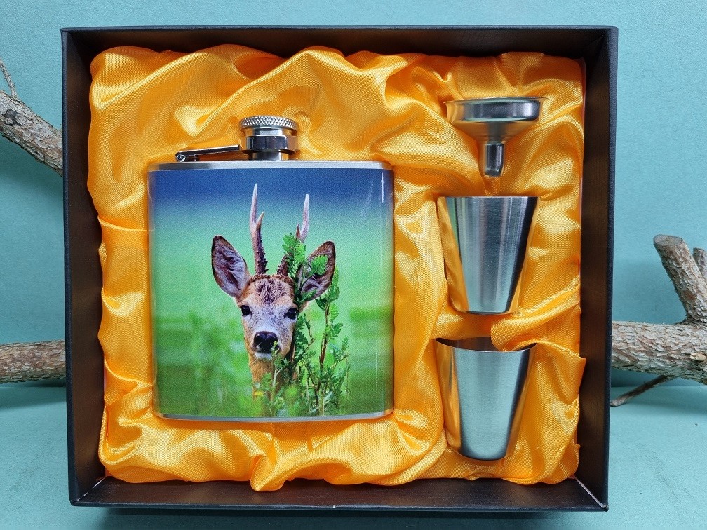 Darčeková sada obsahuje ploskačku s objemom 1,8dcl s motívom srnca, 2 ks pohárikov a lievik. Celý obsah kazety je z nerezového materiálu. Ideálny darček pre milovníkov prírody a lesnej zvery, ktorí majú radi svoj obľúbený nápoj stále pri sebe.