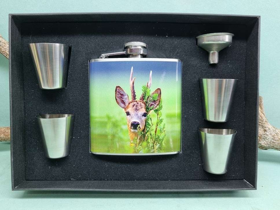 Darčeková sada obsahuje nerezovú ploskačku, 4 poháriky a lievik pre jednoduchšie nalievanie destilátu. Objem ploskačky s motívom srnca je 180ml. Komplet je balený v krásnom darčekovom balení. Sada je vhodná ako dekorácia alebo praktický darček hlavne pre milovníkov prírody a lesnej zvery.