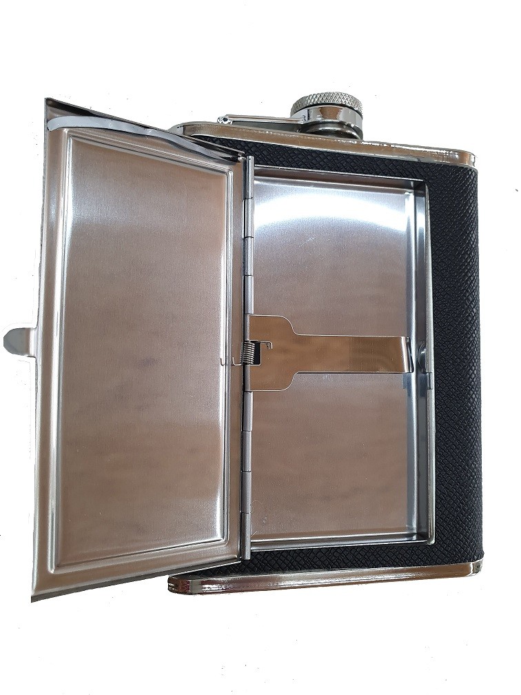 Čierna nerezová ploskačka s objemom 200ml. Na prednej strane sa nachádza tabatierka pre bezpečné uloženie cigariet.