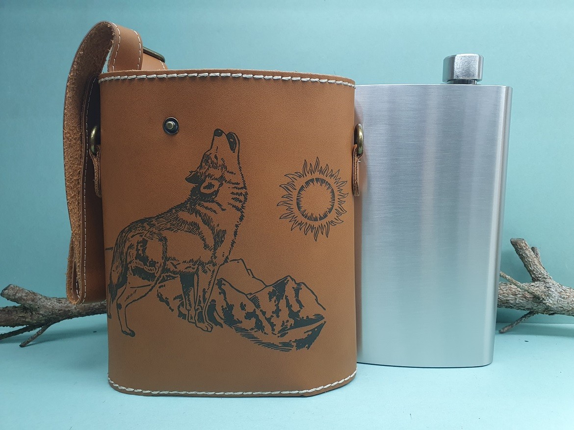 Úvod » Darčekové predmety » Ploskačky » Ploskačky ostatné » Ploskačka v koženom obale s motívom Vlk 1400ml
