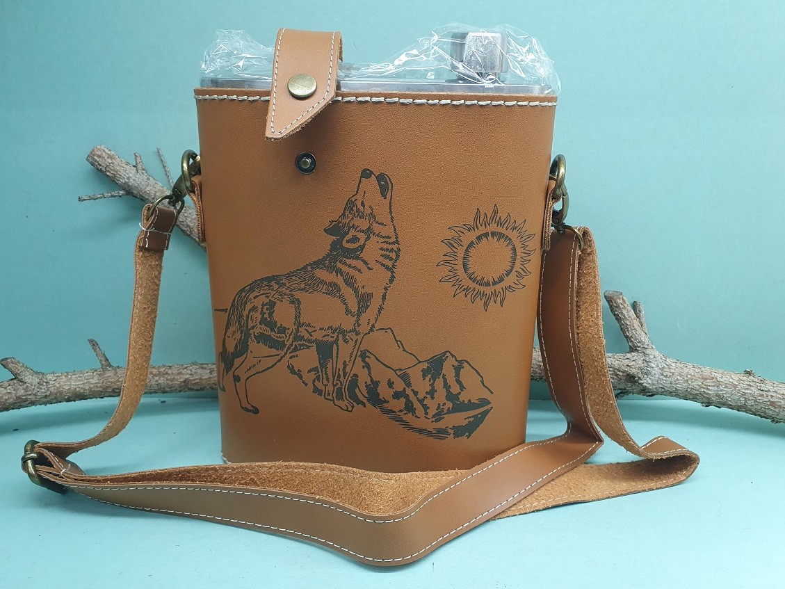 Krásna nerezová ploskačka s objemom 1,4l v koženom obale s motívom vlka a pevným uzáverom na prenos alkoholických nápojov. Obal má popruh na pohodlné prenášanie fľašky. Je praktickým pomocníkom na potulkách prírodou. Veď nie je nič lepšie, ako dúšok svojho obľúbeného nápoja pri sebe.