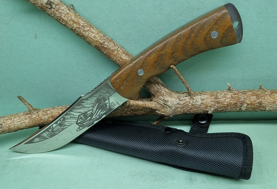 Celokovový poľovnícky nôž s gravírovaným motívom loďky na prednej strane čepele a drevenou tvarovanou rukoväťou. V spodnej časti rukoväte je dierka na prevlečenie šnúrky. Súčasťou je čierne nylónové puzdro s možnosťou upevnenia na opasok.