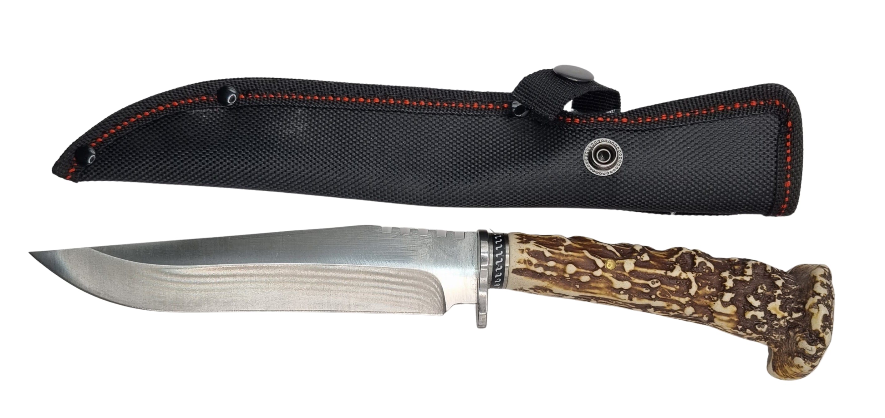 Poľovnícky nôž s nerezovou čepeľou dlhou 17cm. Rukoväť je imitácia parohu s dĺžkou 13cm. Obsahuje čierne nylónové púzdro, ktoré sa dá upevniť na opasok. Celková dĺžka noža je 30cm.