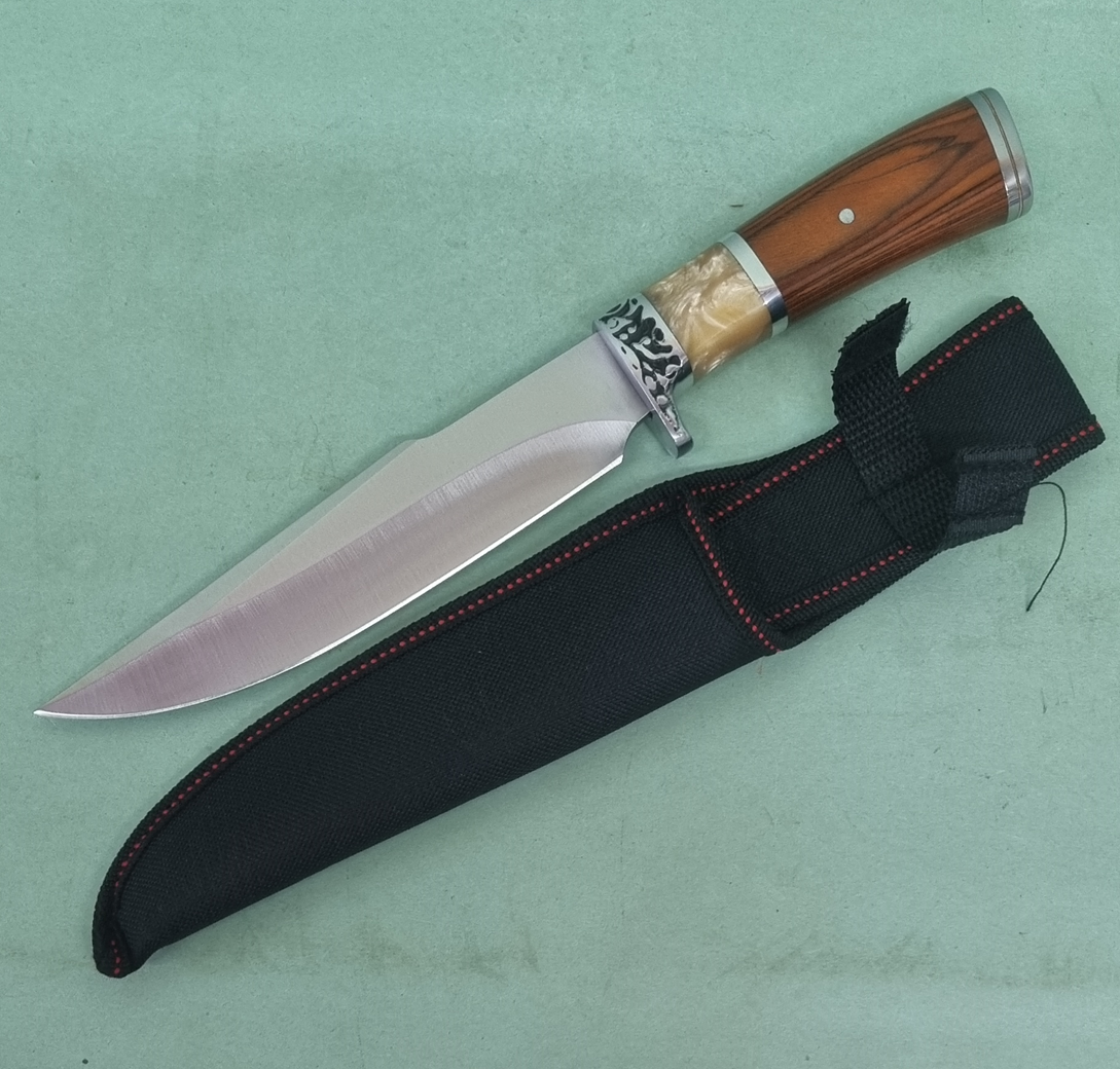 Poľovnícky nôž s nerezovou čepeľou a drevenou rukoväťou. Rukoväť je zdobená vygravírovaným kovom a vsunutým "perleťovým" pásikom. Celková dĺžka noža je 30,5cm čepeľ je dlhá 18cm. Súčasťou je čierne nylónové puzdro.