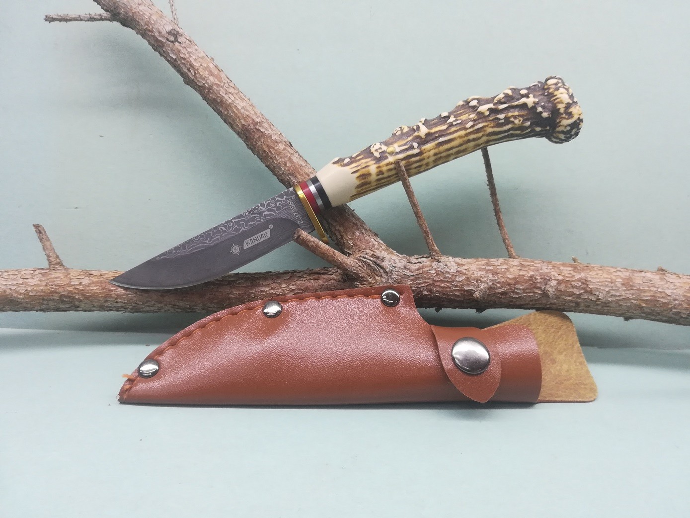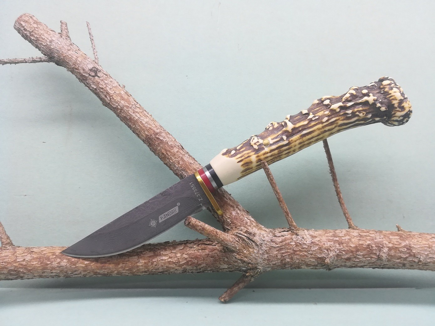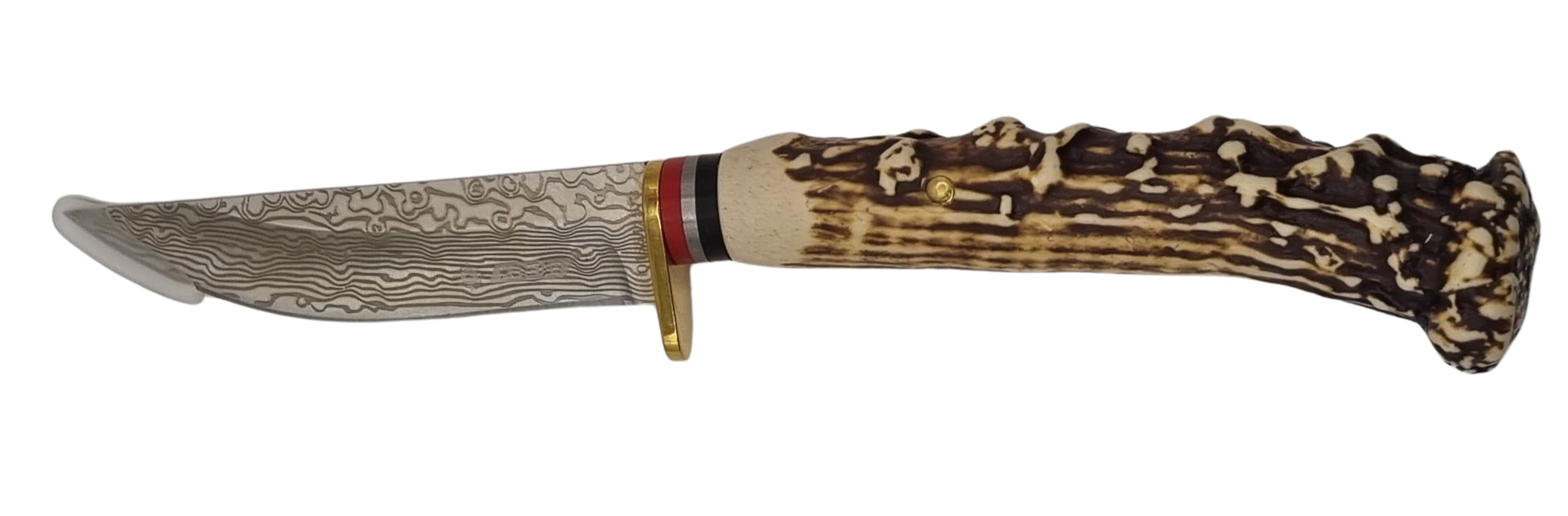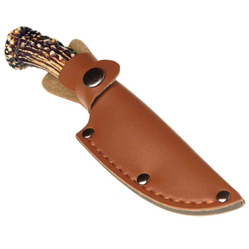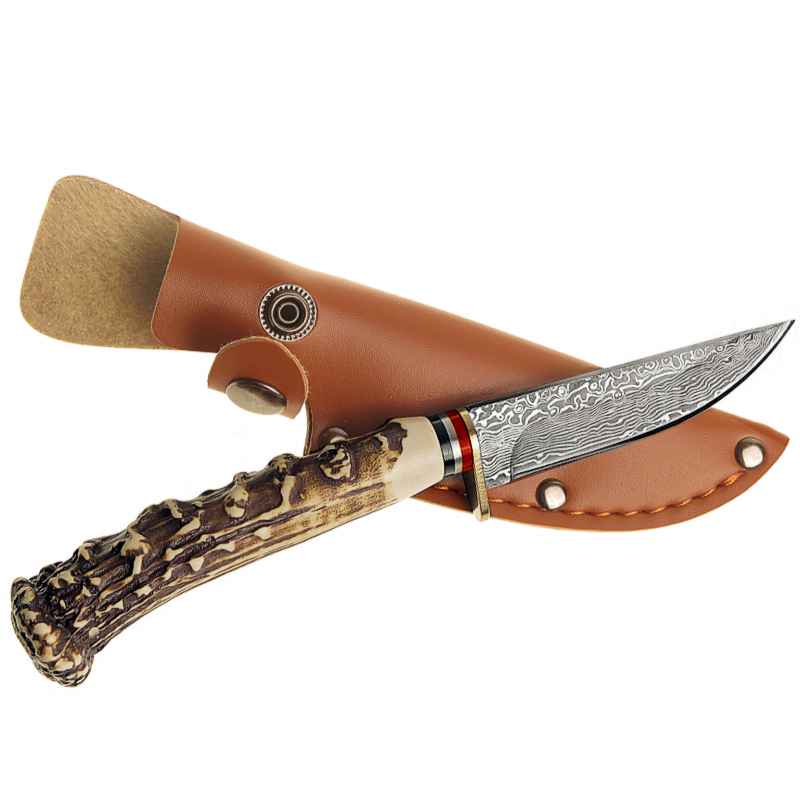 Poľovnícky nôž s gravírovanou čepeľou s damaškovým motívom a rukoväťou imitujúcou paroh. Súčasťou je hnedé kožené puzdro s možnosťou uchytenia na opasok.