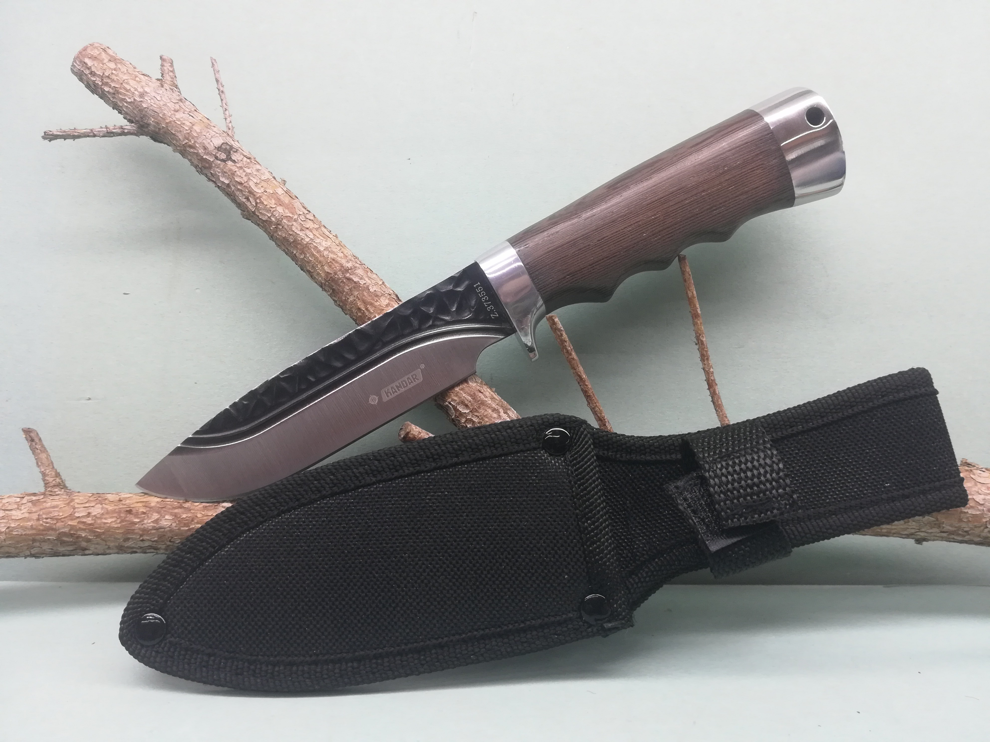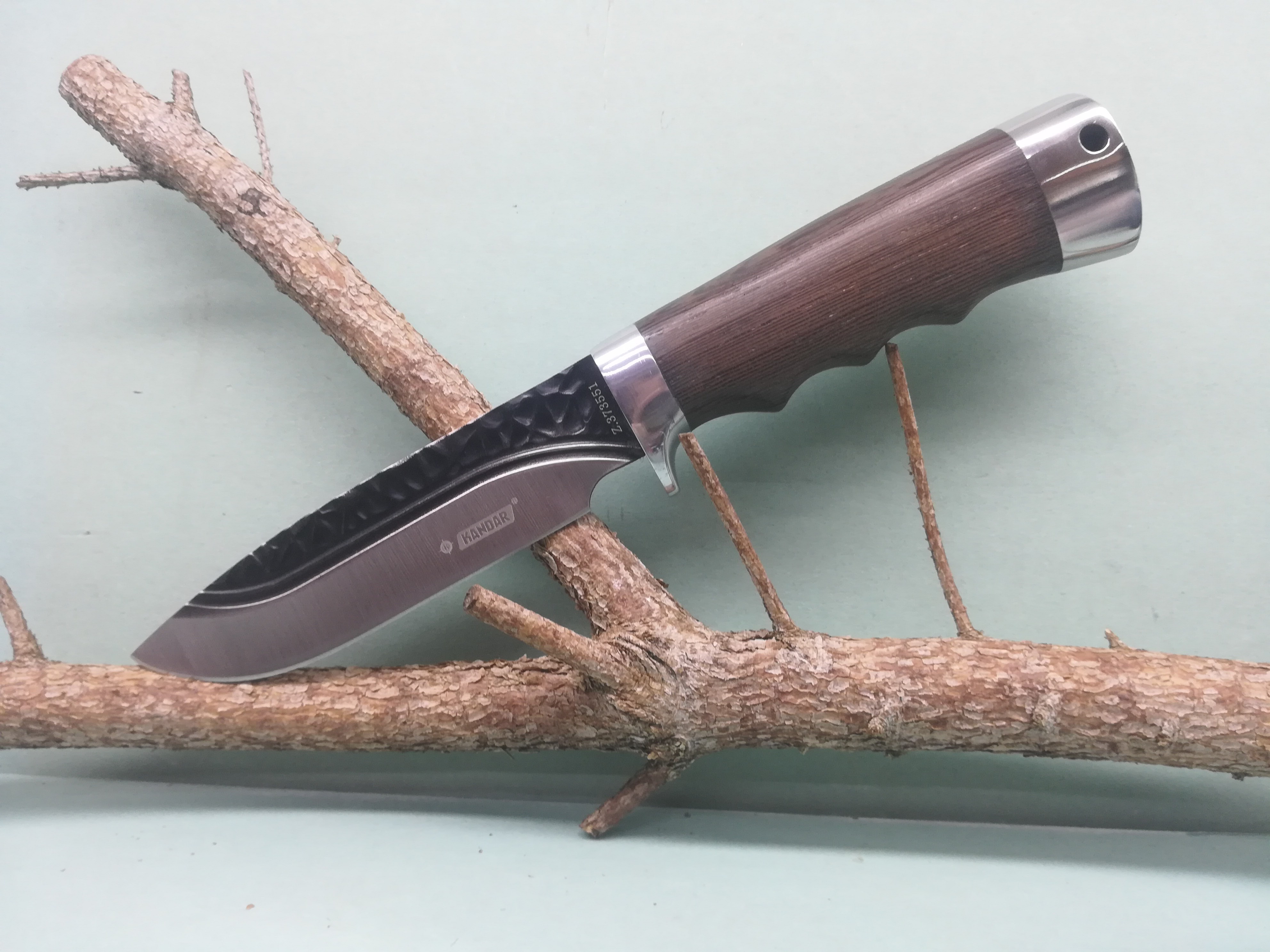 Poľovnícky nôž s tvarovanou rukoväťou kombinácia drevo-kov a vzorovanou čepeľou. Na spodnej strane rukoväte sa nachádza dierka na prevlečenie šnúrky. Súčasťou je čierne nylónové puzdro s možnosťou uchytenia na opasok.