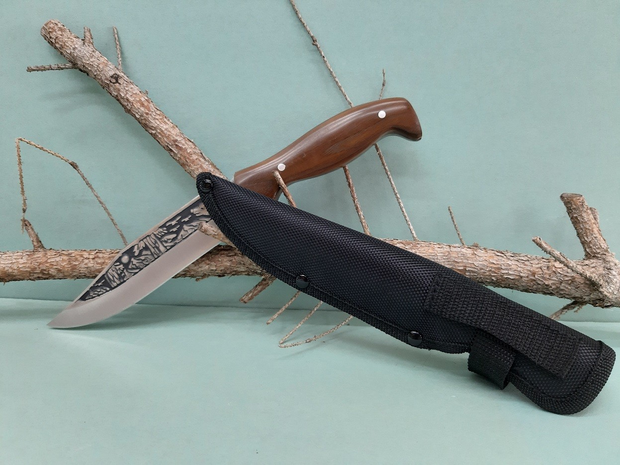 Poľovnícky nôž Kandar s rytinou lesa na čepeli s veľkosťou 15 cm a drevenou rukoväťou. Dodáva sa s čiernym nylonovým puzdrom. Celková dĺžka noža je 26 cm.