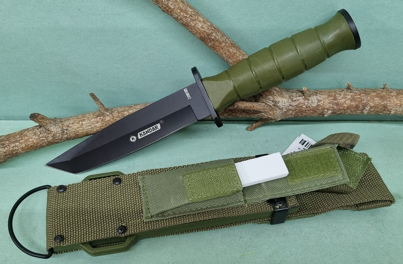 Poľovnícky nôž s čiernou čepeľou a zelenou plastovou rukoväťou. Súčasťou je zelené plastovo textilné puzdro, ktoré je možné uchytiť na opasok. V puzdre sa nachádza brusný kameň.