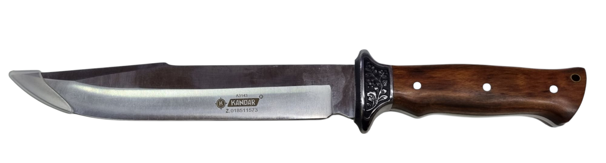 Kandar poľovnícky nôž s nerezovou čepeľou dlhou 20cm a rukoväťou ktorá je kombinácia dreva a kovu. Celková dĺžka noža je 32cm. Obsahuje nylónové puzdro s možnosťou uchytenia na opasok.