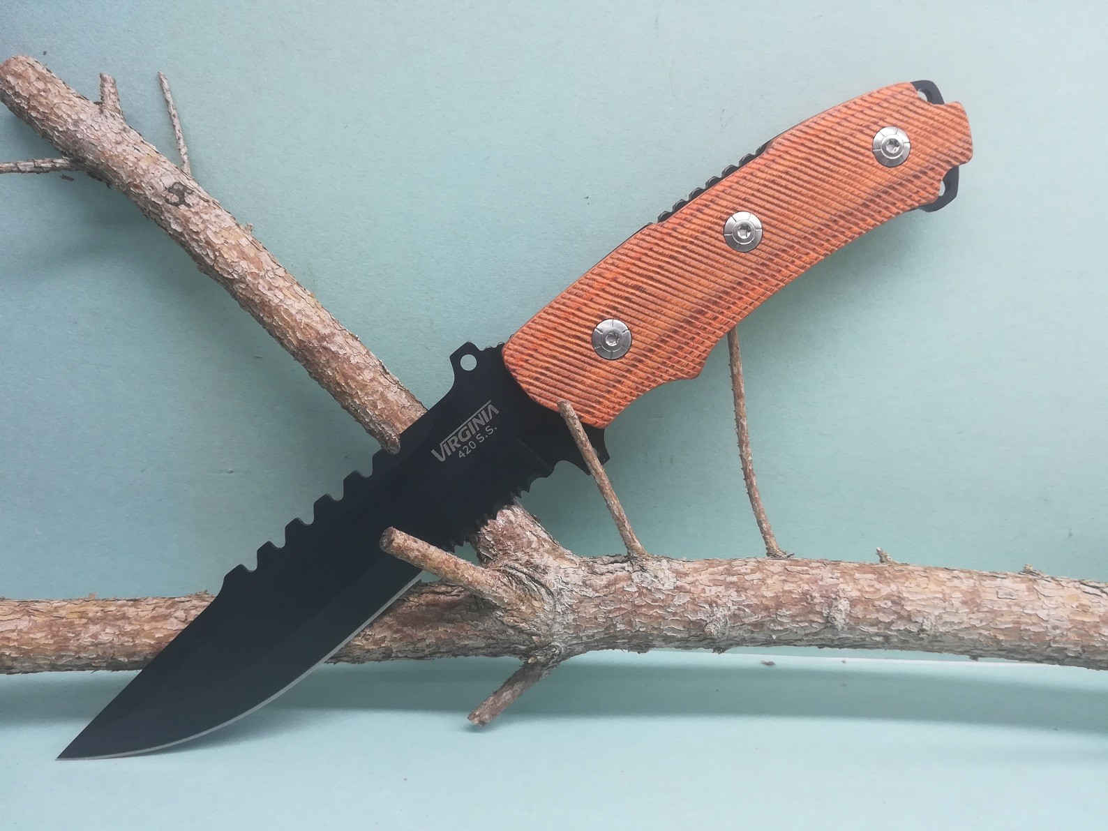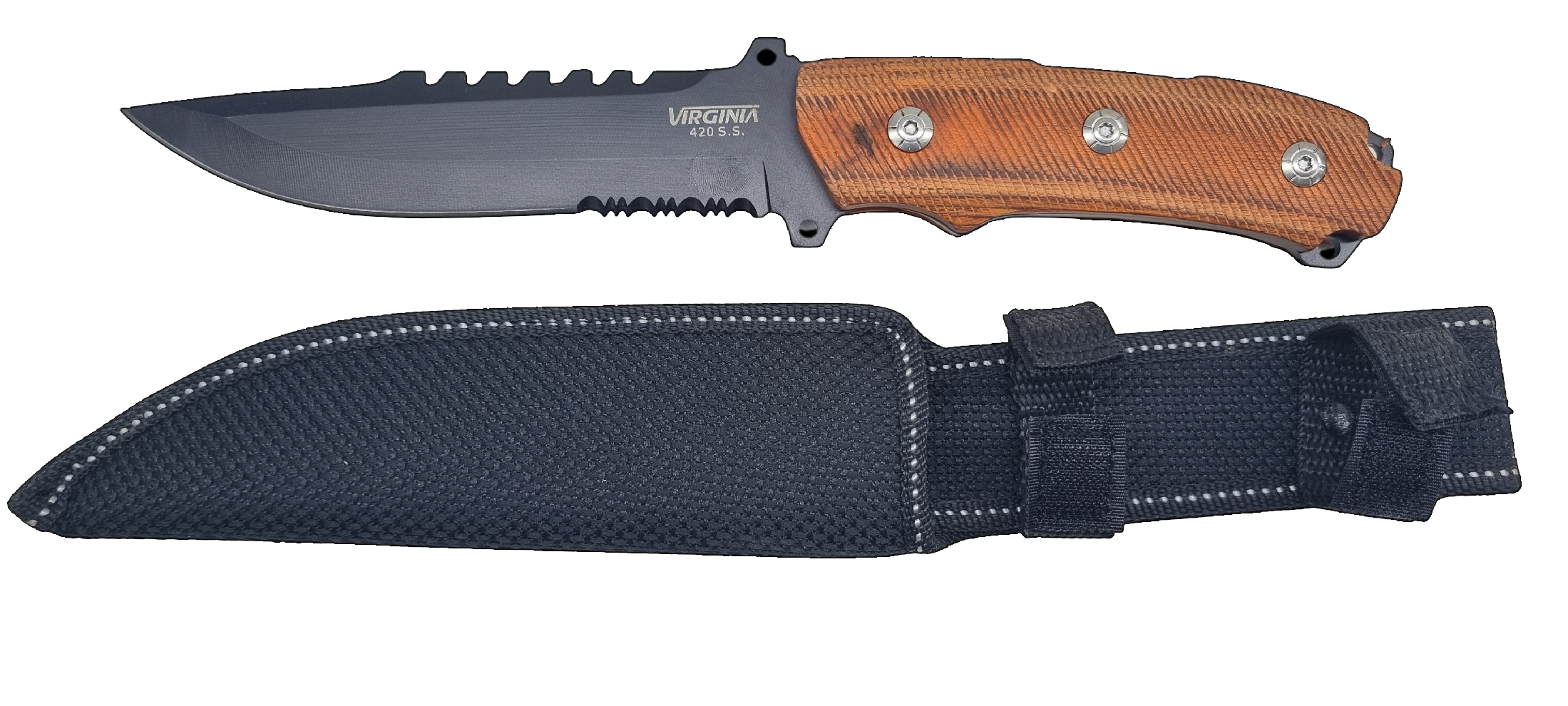 Celokovový poľovnícky nôž s drevenou protišmykovou rukoväťou a nerezovou čepeľou 420 potiahnutou teflónom. Rezná časť je kombinovaná s pílkou. Súčasťou je aj čierne textilné puzdro.