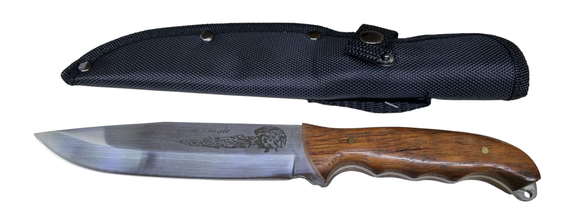 Poľovnícky celokovový nôž s gravírovaným motívom Orol na jednej strane čepele a drevenou tvarovanou rukoväťou. Na konci rukoväte je otvor. Celková dĺžka noža 26cm, dĺžka čepele 14cm. Súčasťou je čierne nylónové puzdro s možnosťou uchytenia na opasok.