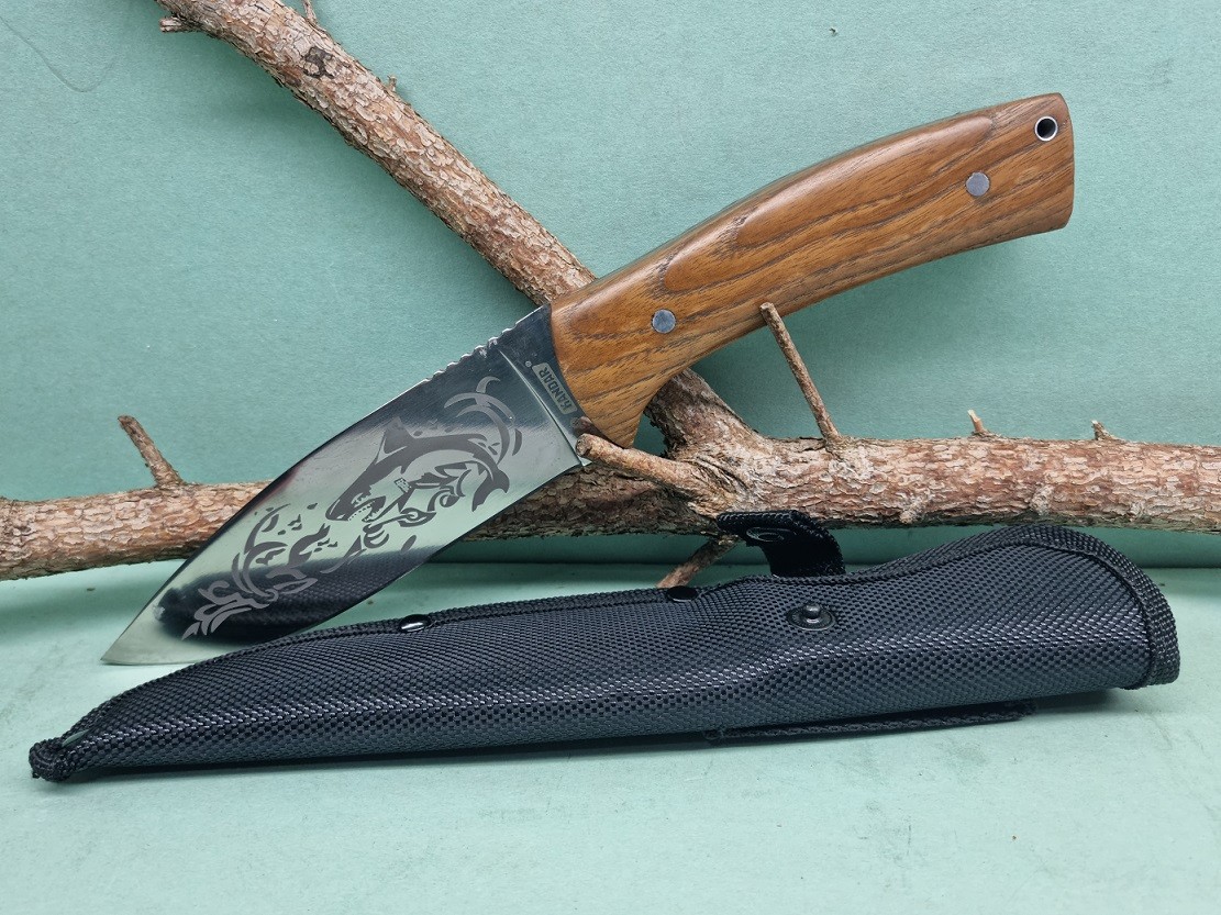 Poľovnícky celokovový nôž s gravírovaným motívom žraloka na prednej strane čepele a drevenou tvarovanou rukoväťou. V spodnej časti rukoväte sa nachádza dierka na prevlečenie šnúrky. Súčasťou je čierne nylónové puzdro s možnosťou upevnenia na opasok.