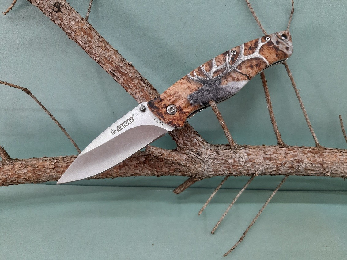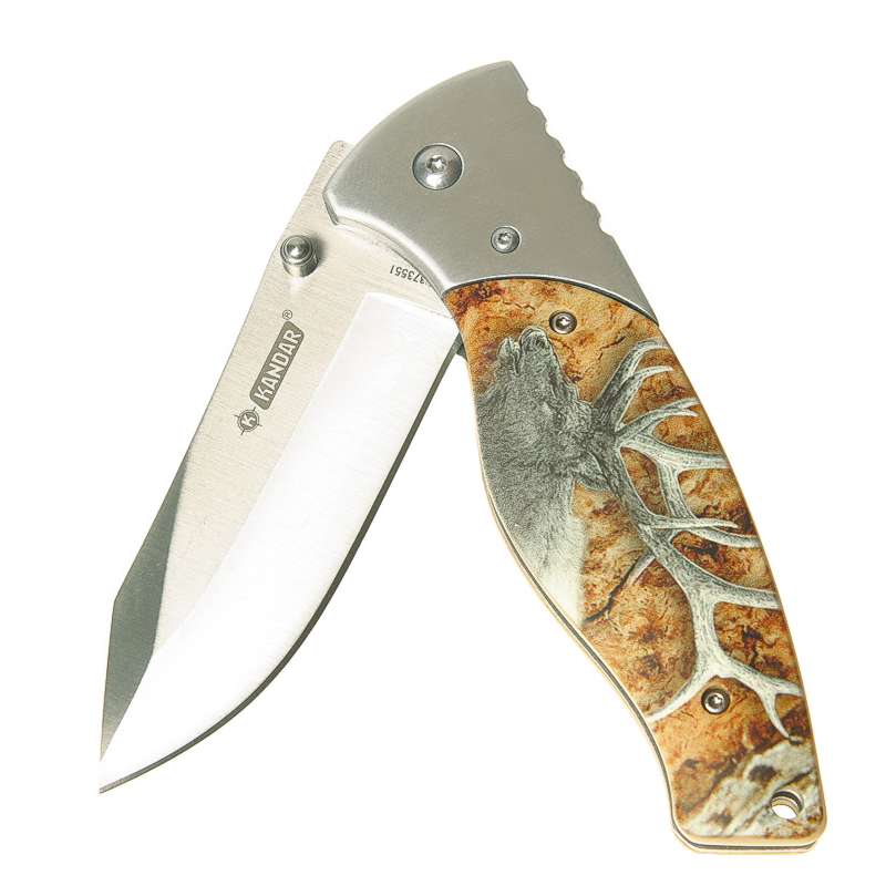 Vreckový zatvárací nôž Kandar s 8cm nerezovou čepeľou. Kovovou rukoväťou s motívom jeleň, s poistkou proti samovoľnému zatvoreniu noža a očkom na prevlečenie šnúrky alebo lanka. Celková dĺžka noža je 18cm. Na zadnej časti má klip na zavesenie na opasok.