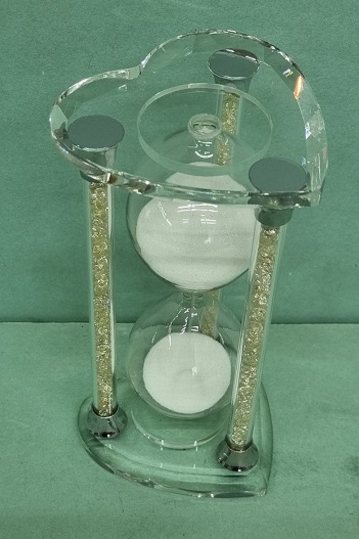 Tieto krásne presýpacie hodiny v sklenom ráme s podstavcami v tvare srdca Vám spríjemnia voľné chvíľky. Piesok je bielej farby. Čas jedného presypu je cca 15 minút. Výška je 16,5cm, šírka srdca je 8,5cm