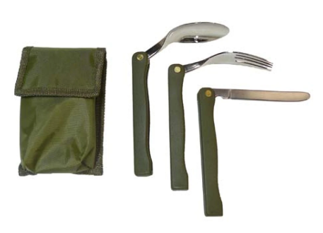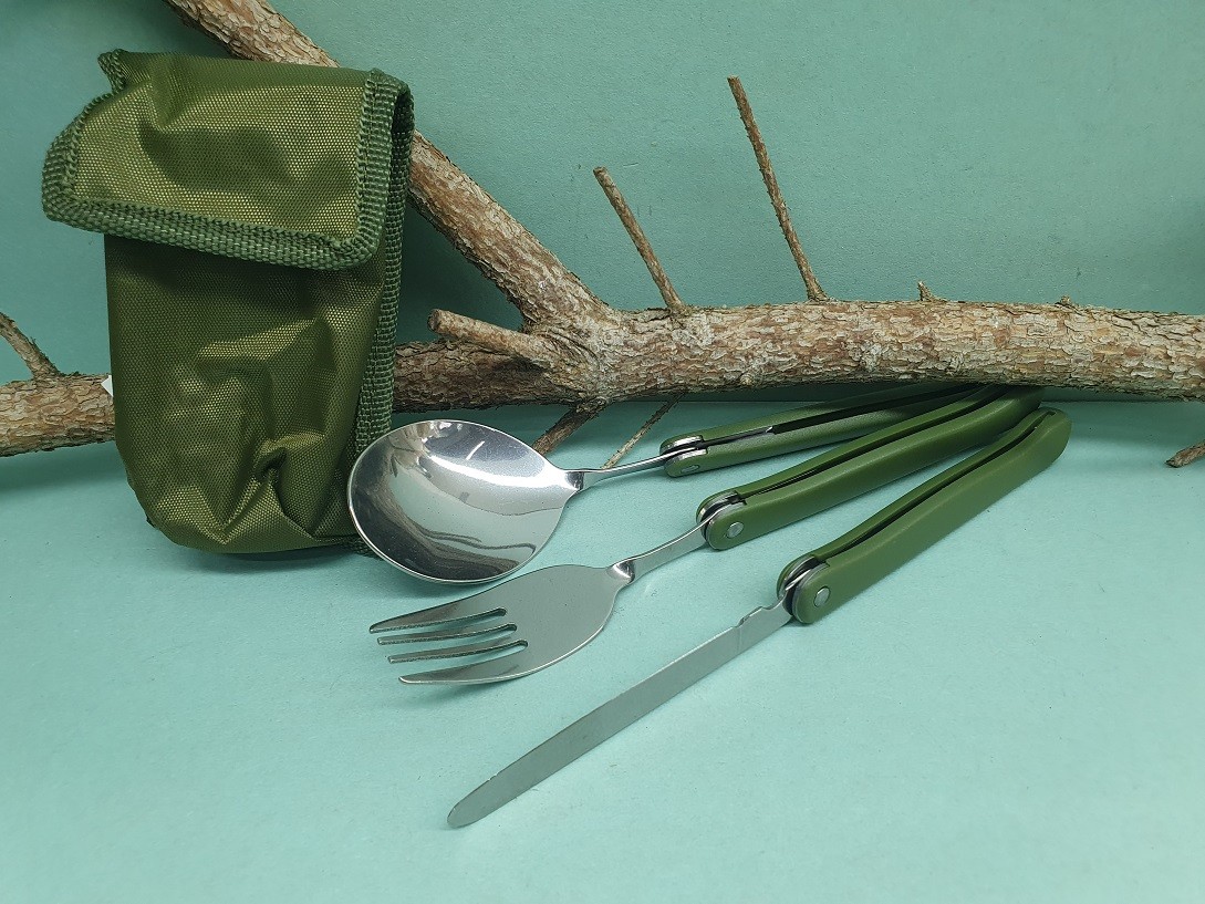 Turistický nerezový príbor s plastovou rúčkou obsahuje lyžicu, vidličku a nôž. Nerezová časť sa sklopí a môže sa schovať do textilného púzdra, ktorý je jeho súčasťou. Vhodný je na cestách, turistike, kempovaní aj rybačke.