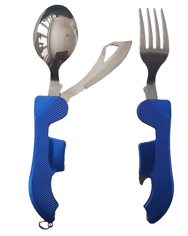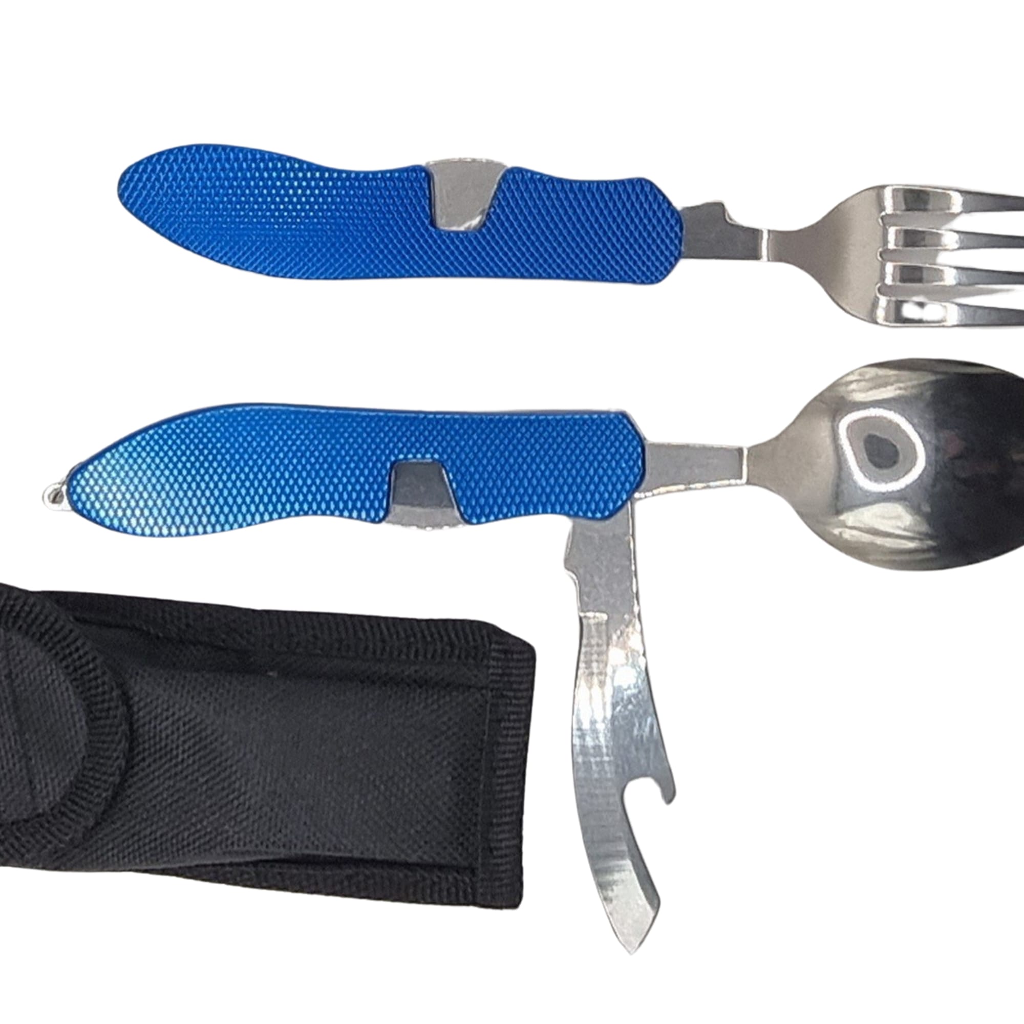 Turistický modrý príbor je vhodný na cestách, turistike, kempovaní aj rybačke. Obsahuje vidličku, lyžicu, nôž, otvárač na víno a otvárak na konzervy.