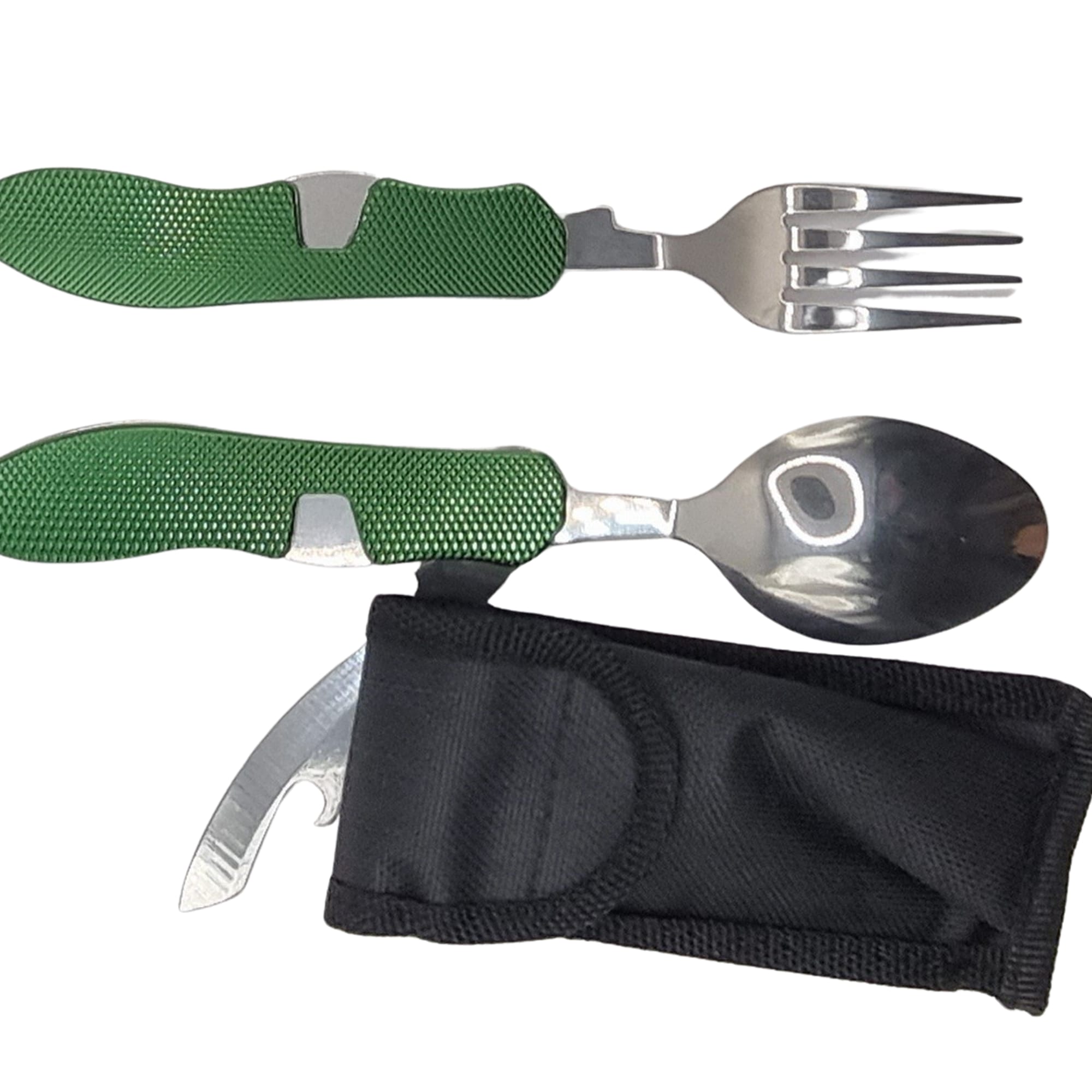 Turistický zelený príbor je vhodný na cestách, turistike, kempovaní aj rybačke. Obsahuje vidličku, menšiu lyžicu, nôž, otvárač na konzervy.
