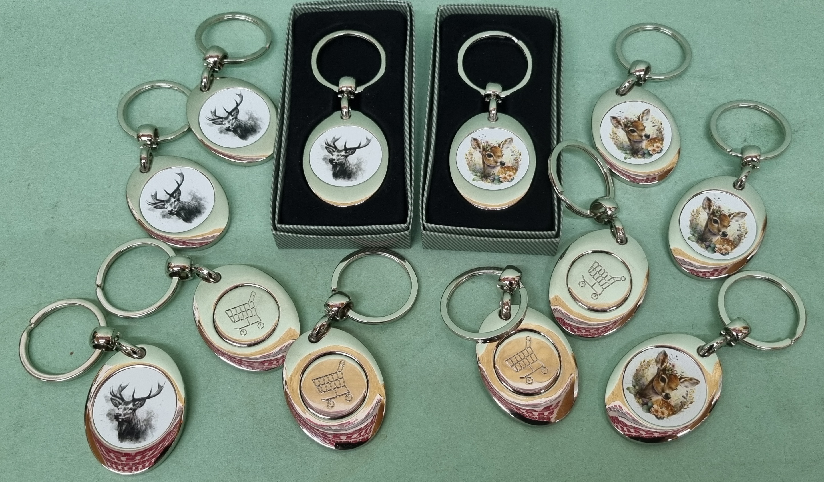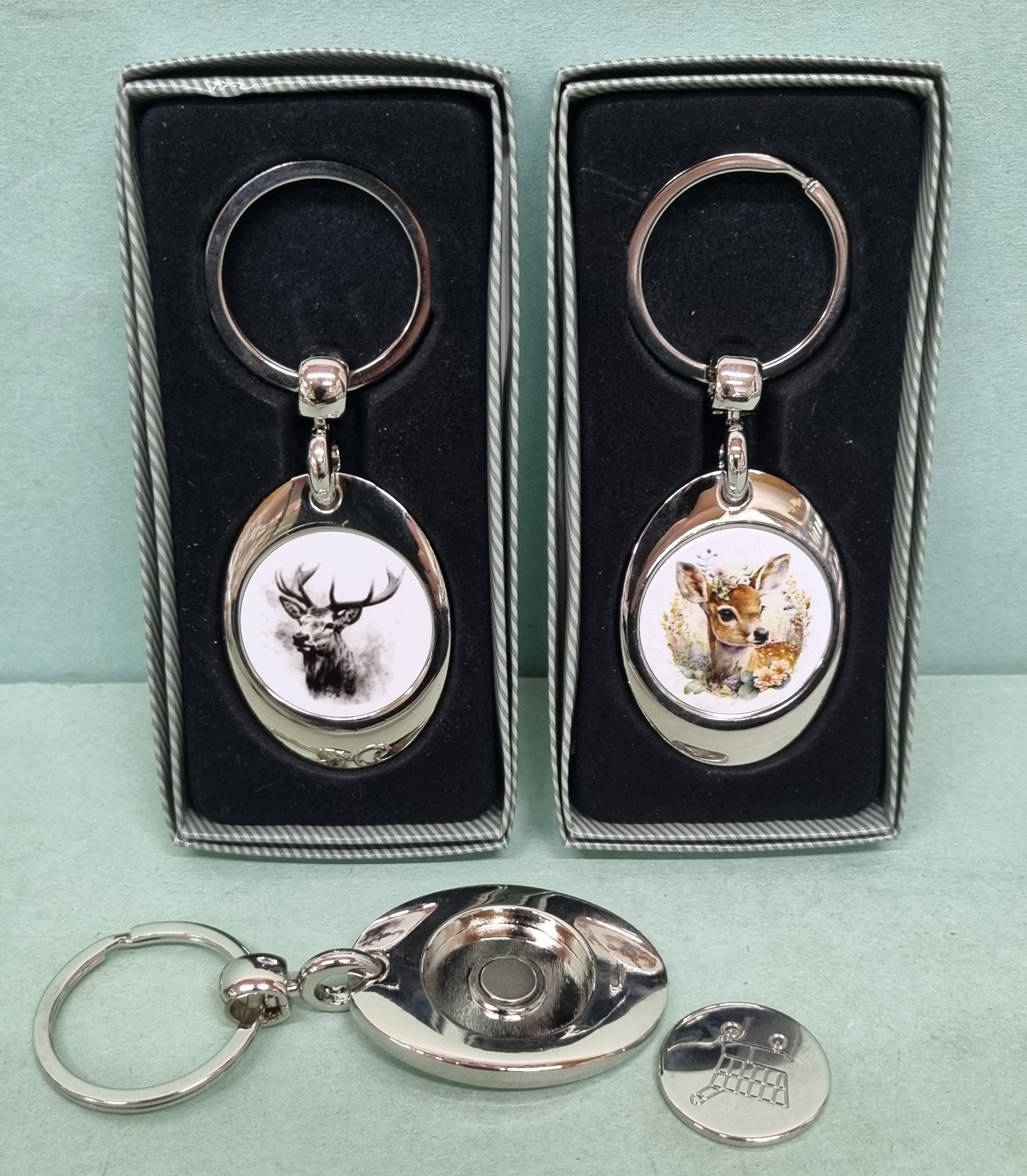 Kovový prívesok na kľúče s poľovníckym motívom so žetónom do nákupného vozíka, v darčekovej krabičke.